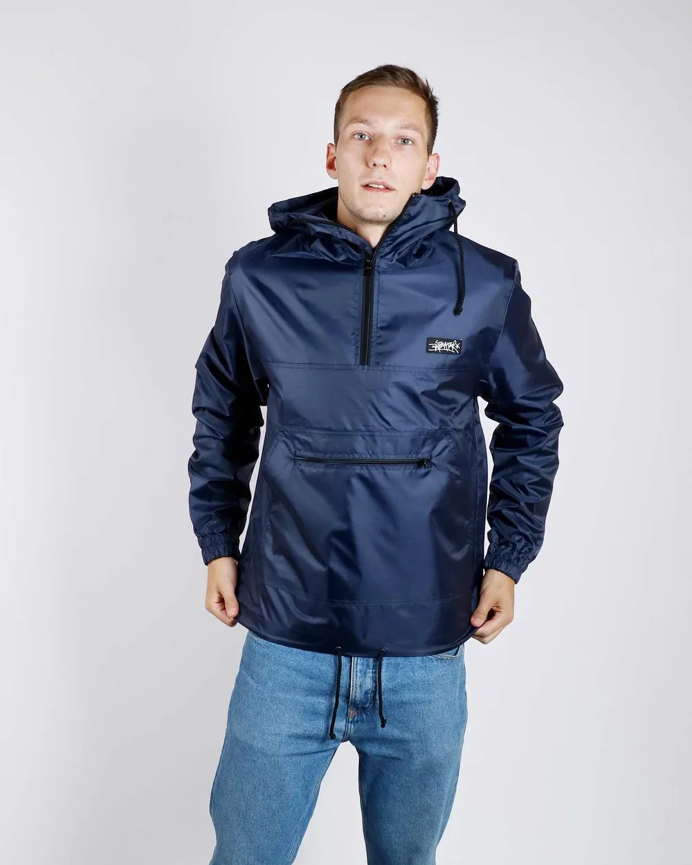 Ветровка анорак Anteater, надевается через голову. Карман кенгуру на молнии, с сетчатым слоем сверху. Вентиляционные отверстия по бокам, удобный капюшон.