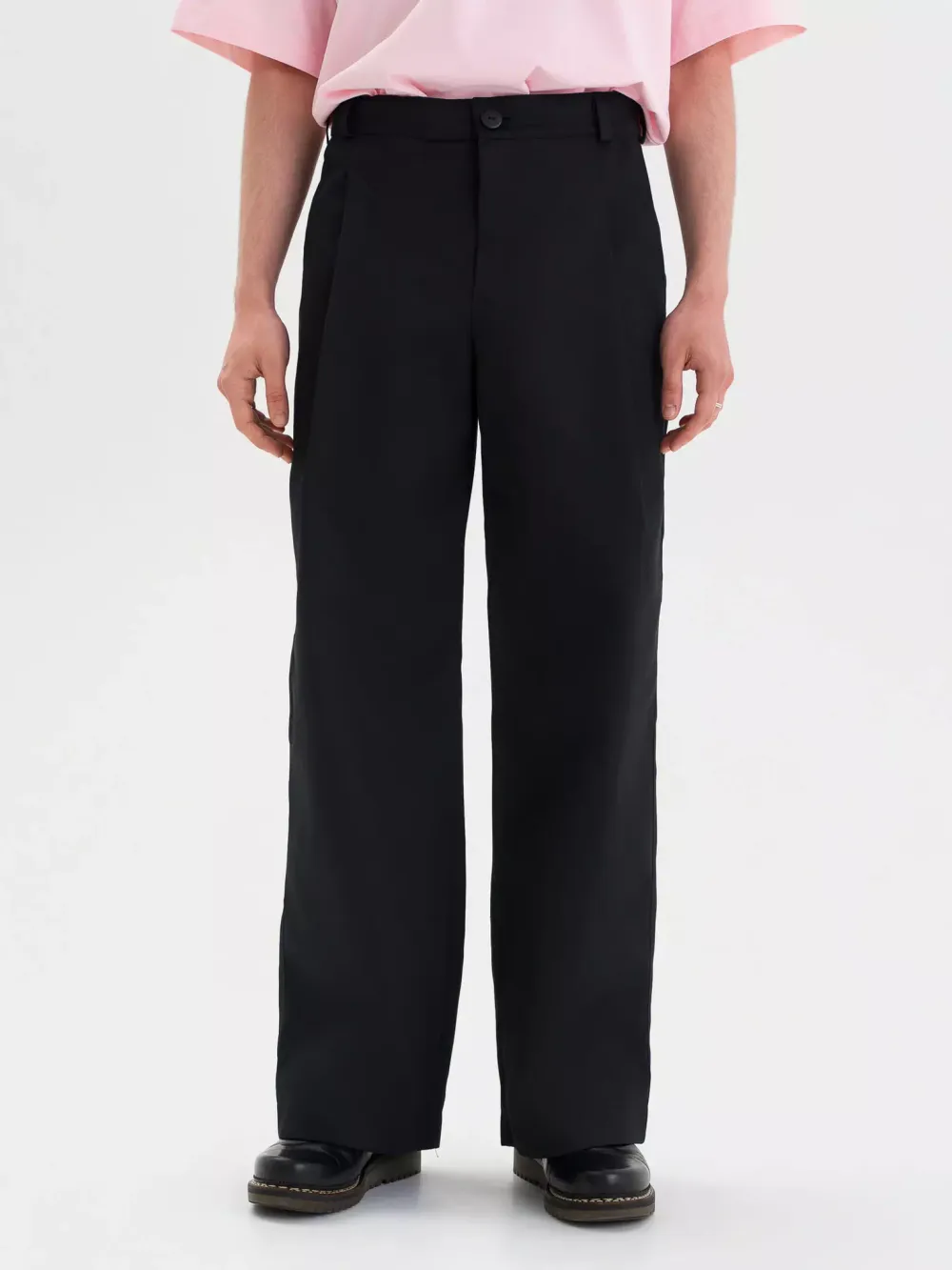 Объемные прямые брюки с защипами из плотной хлопковой ткани - стильная и модная модель, которая отлично сидит и создает легкий образ. Их особенностью является широкий крой и защипы на передней части брюк, которые добавляют дополнительный объем и интересный акцент. Эта модель идеально сочетается с различным верхом и обувью, позволяя создавать разнообразные стильные образы для любого случая.