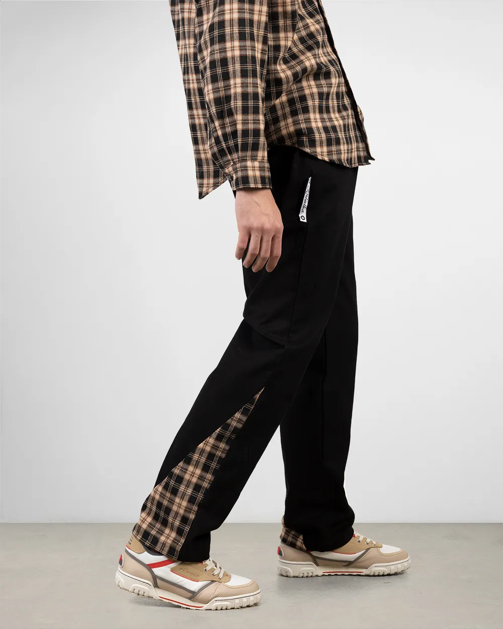 Брюки выполнены из качественного хлопка. По бокам внизу штанин вшиты вставки из клетчатой ткани. Также на нижней части изделия расположены фиксаторы на резинке, для регулировки ширины брючины.