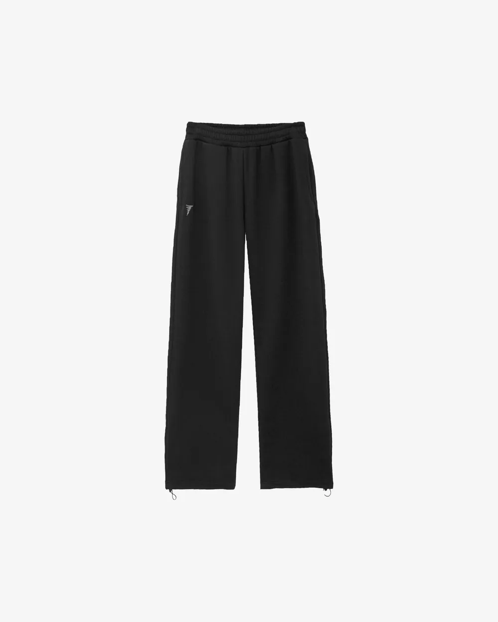 Прямые оверсайз брюки с нашим лого из футера черного цвета со скрытой регулируемой резинкой внизу.