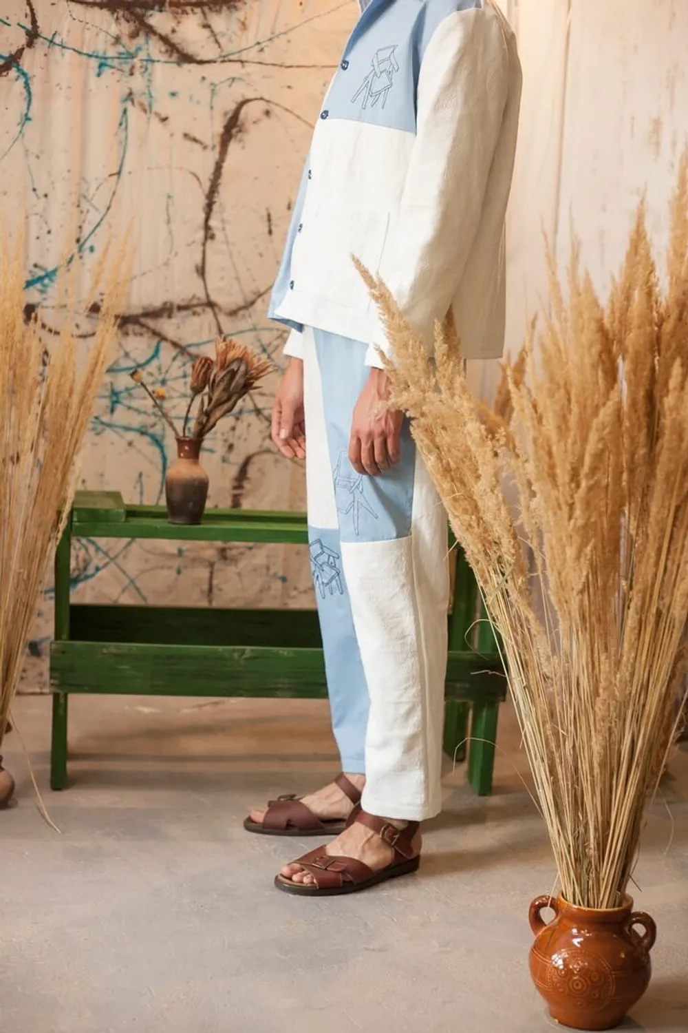 Костюм сделан из белого одеяла, периода 1970х годов, и занавесок. Костюм украшен ручной вышивкой, которая вдохновлена предметами интерьера, созданными архитектором и дизайнером - Ле Корбюзье.
