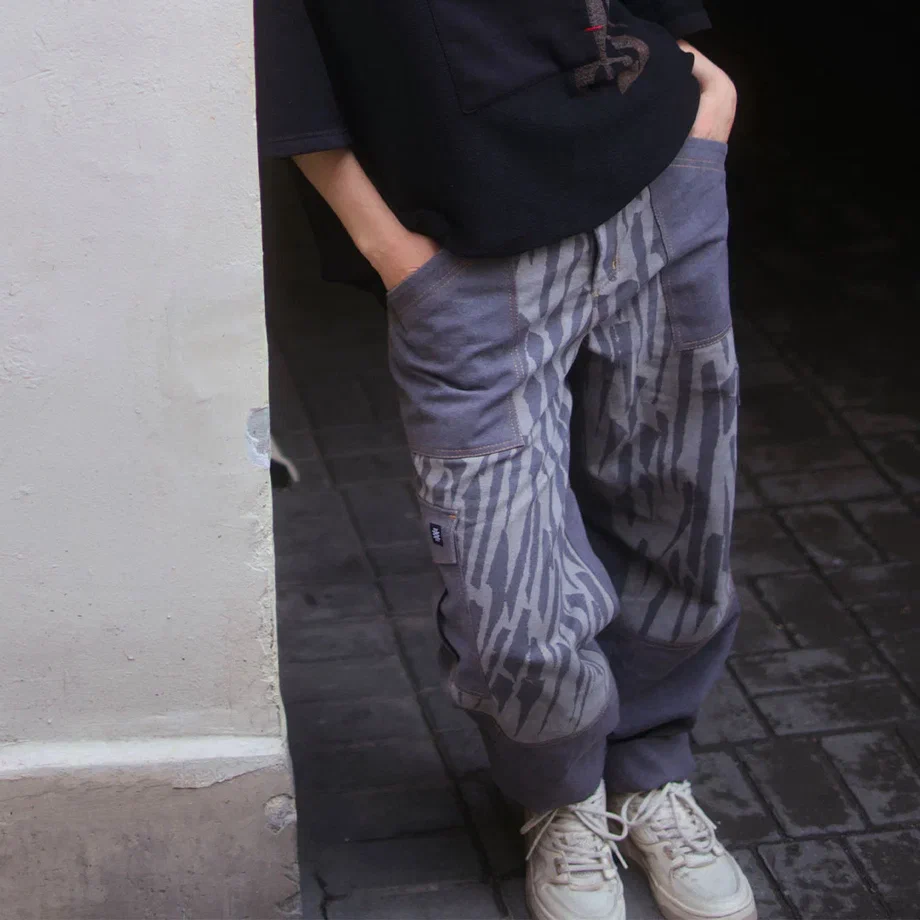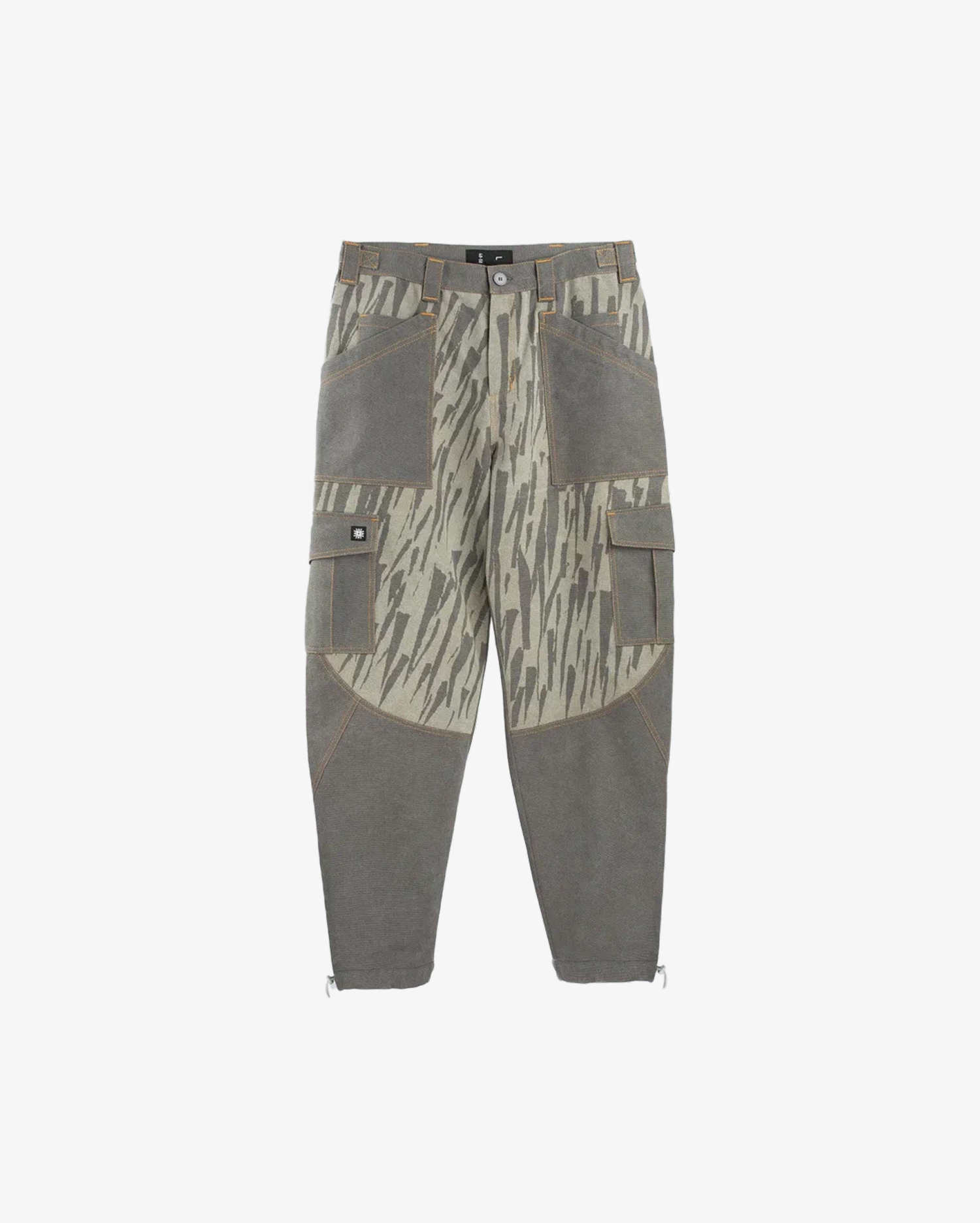 Брюки свободного кроя. Низ брюк регулируется фиксатором с резинкой. Гульфик на застежке - молнии. Пояс втачной застежка - пуговица. Брюки имеют 10 карманов.