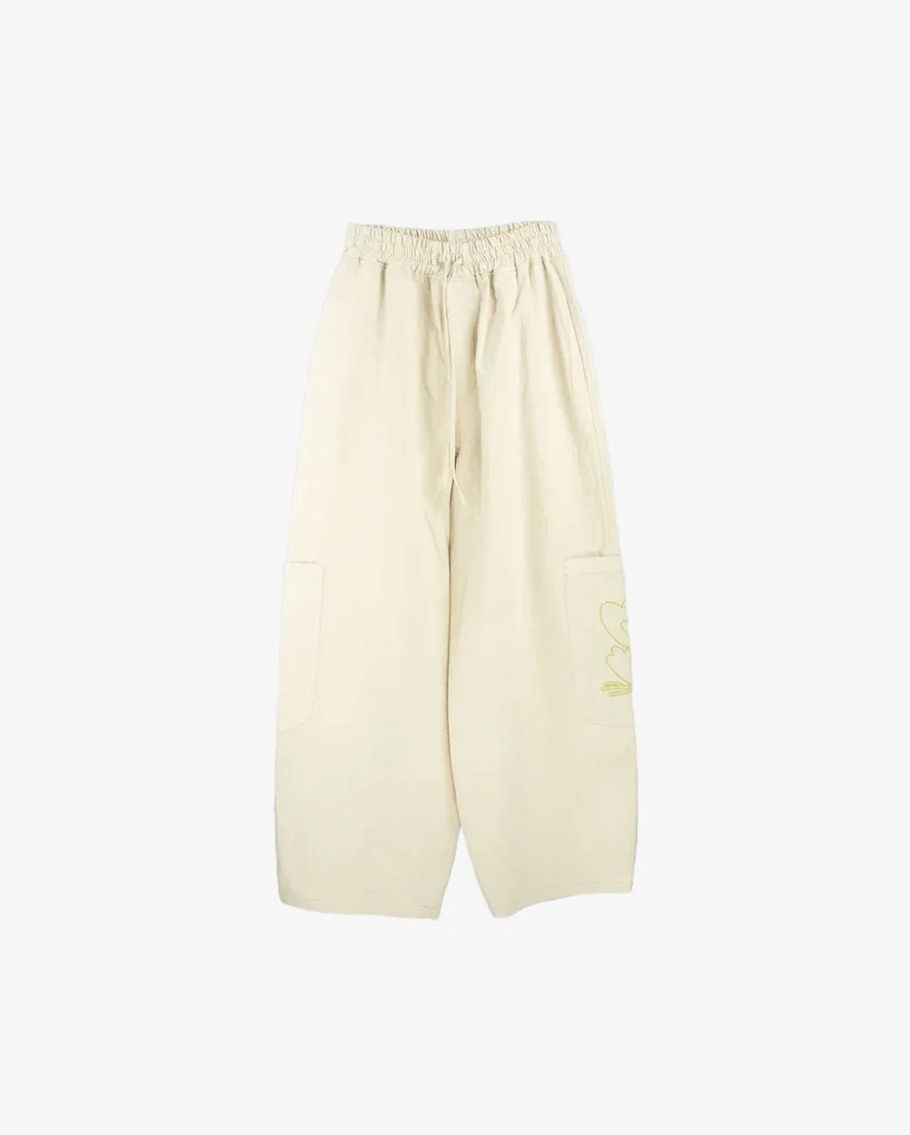 Брюки свободного кроя с притачным поясом на резинке со шнурком. В боковых швах расположены небольшие карманы. На задней правой половинке накладной карман с хлястиком. По бокам в районе колена вместительные накладные карманы.