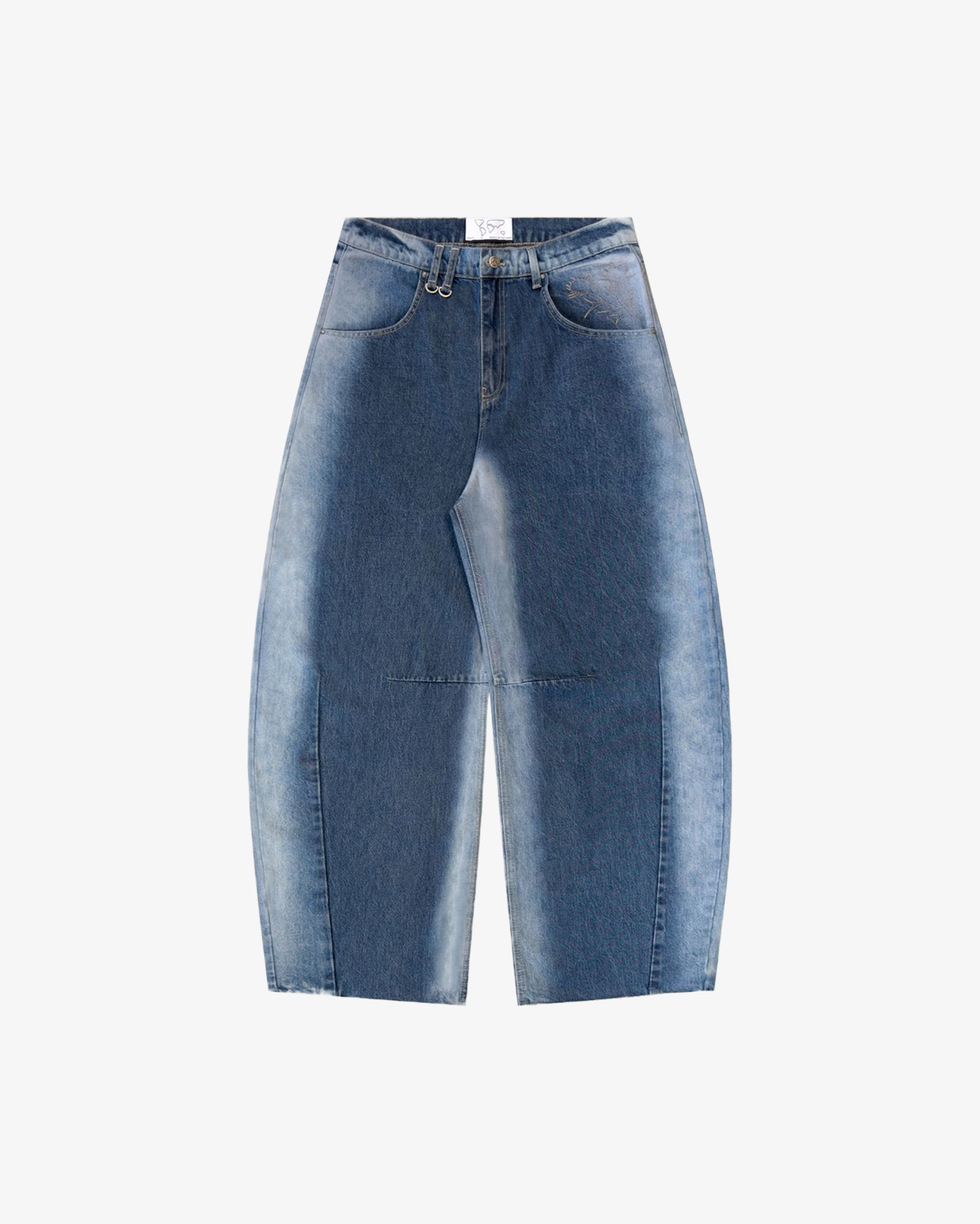 Широкие джинсы с U-образным силуэтом, выполненные из плотного денима весом 14.2 oz, сотканного из органического хлопка качества пенье. Благодаря использованию длинноволокнистого хлопка ткань отличается высокой износостойкостью и плотной, не рыхлой текстурой.
