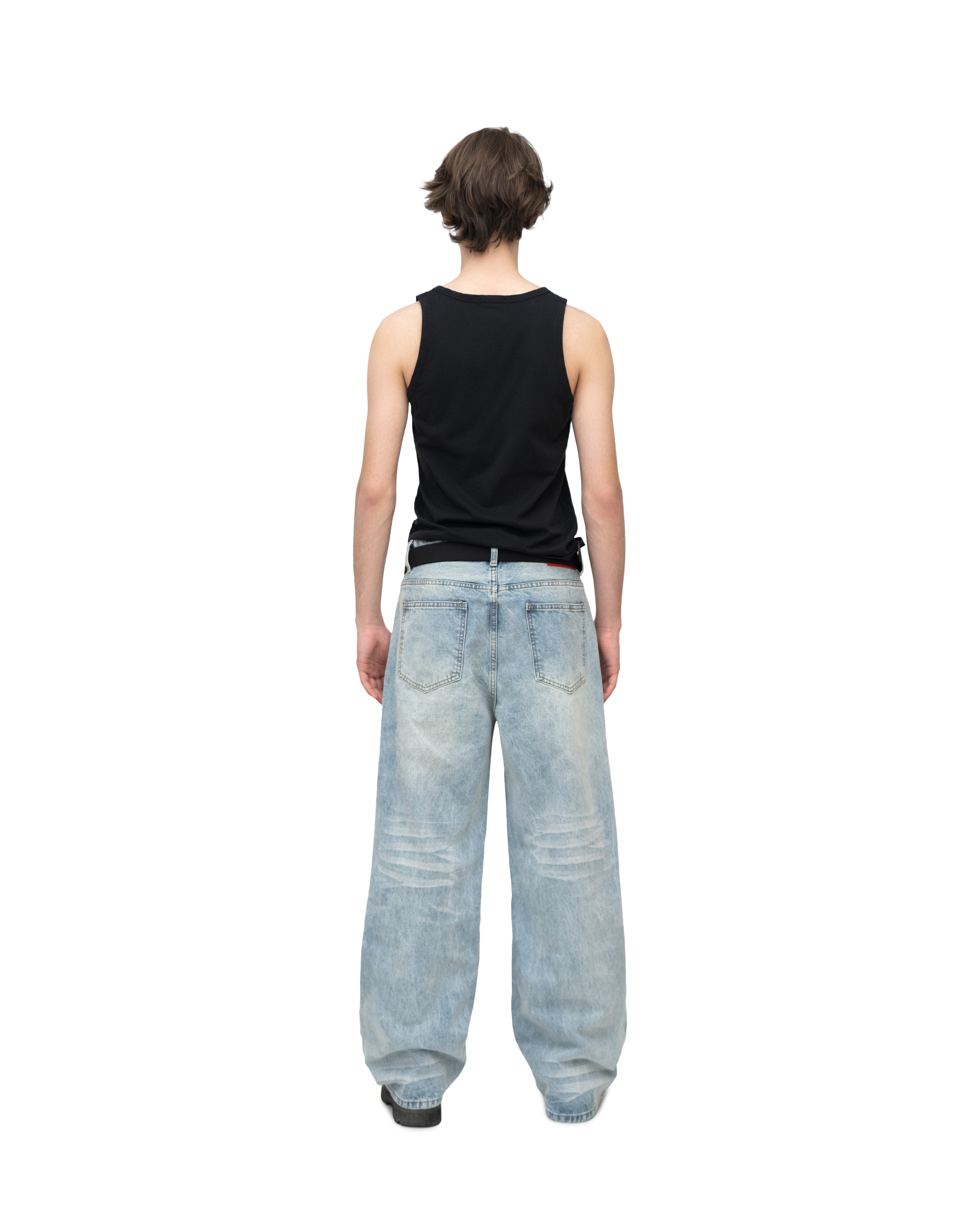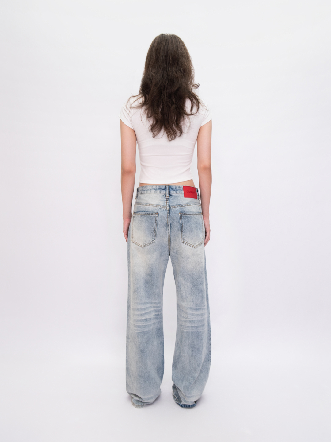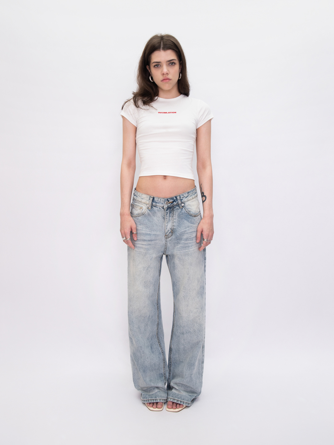 Джинсы свободного кроя из хлопкового денима. Средняя / низкая посадкая. Абсолютно универсальный выстиранный голубой цвет денима идеально впишется в твой летний образ. Фирменная ярко-красная нашивка с логотипом OVUM.