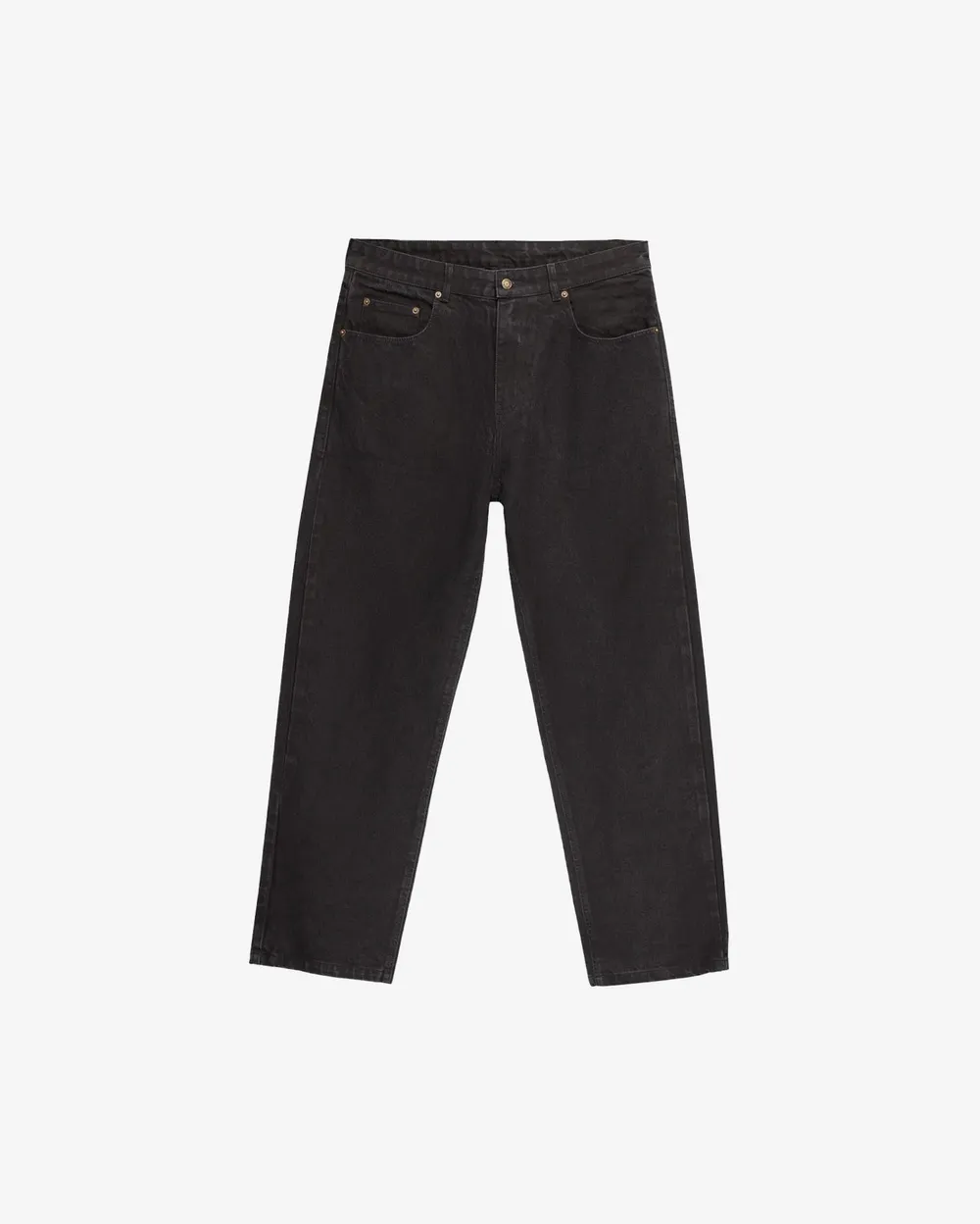 Классический силуэт с пятью карманами, задние украшены контурной вышивкой логотипа бренда. Над задним карманом — жакрон из натуральной кожи. Брендированная кнопка и заклепки.