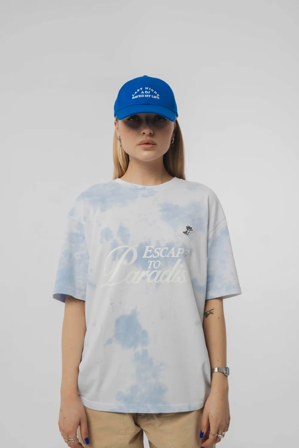 Переиздание футболки из плотного хлопка, окрашенной техникой Tie Dye с шелкографией и нашивкой на груди