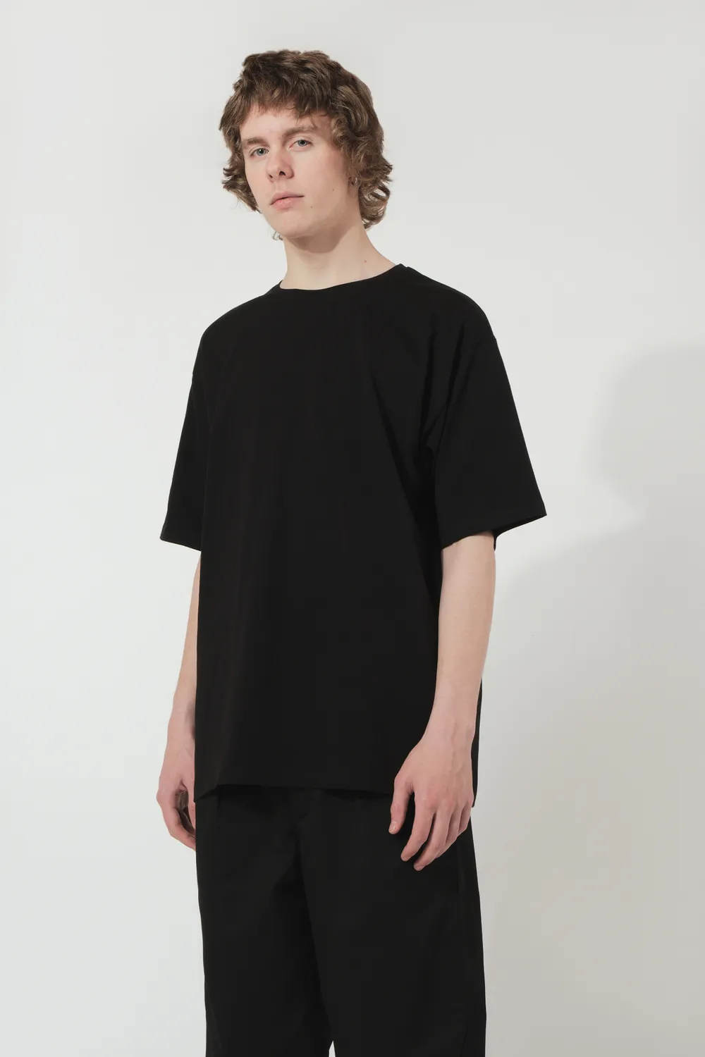 Объёмная черная футболка из мягкого хлопка для основы базового гардероба. Со спущенной линией плеча и круглым вырезом.