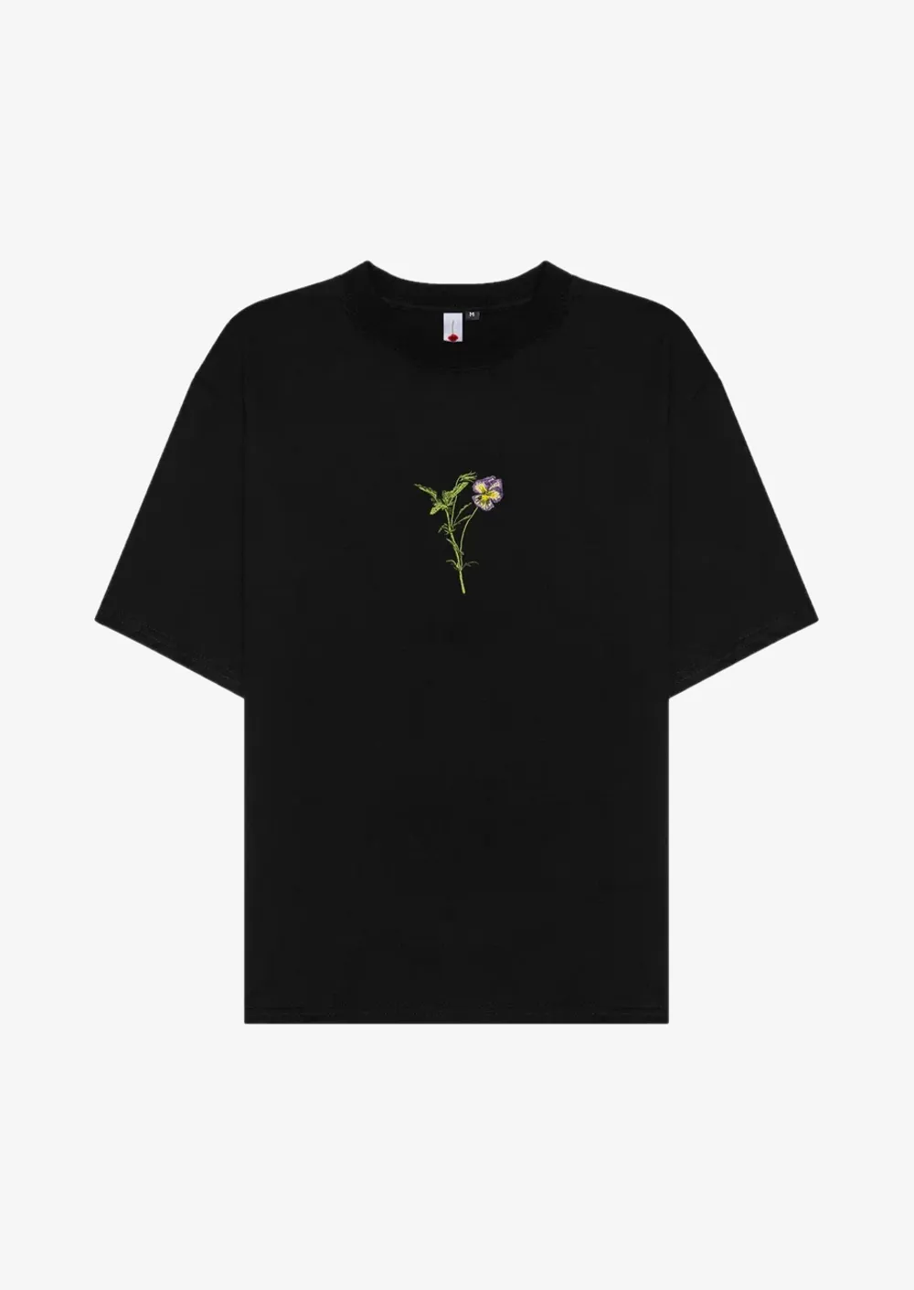 Круглый вырез под горло, горловина выполнена из основного материала, заниженные плечи, прямой крой, вышивка Анютины глазки.