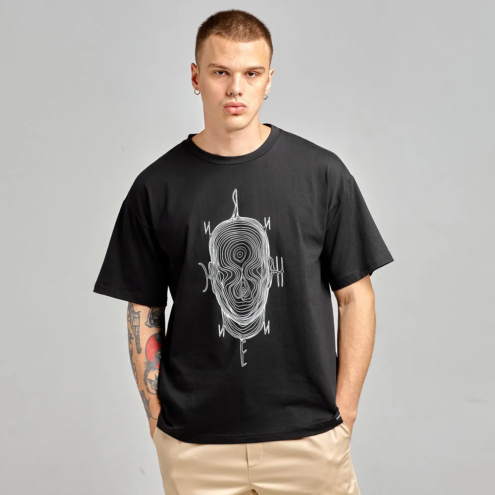 Базовая модель. Оверсайз. Круглый вырез под горло в рубчик. Заниженные плечи. Прямой крой. Принт на груди от известного питерского тату-мастера Павла Гриндера.