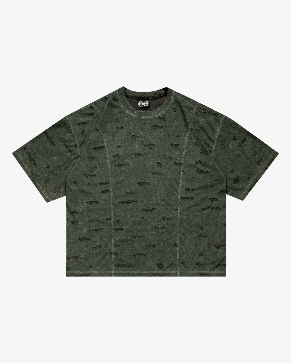 Футбока оверсайз, сложного кроя, выполненная из двуслойной не плотной ткани обработанной лазером и сваренной по технолигии