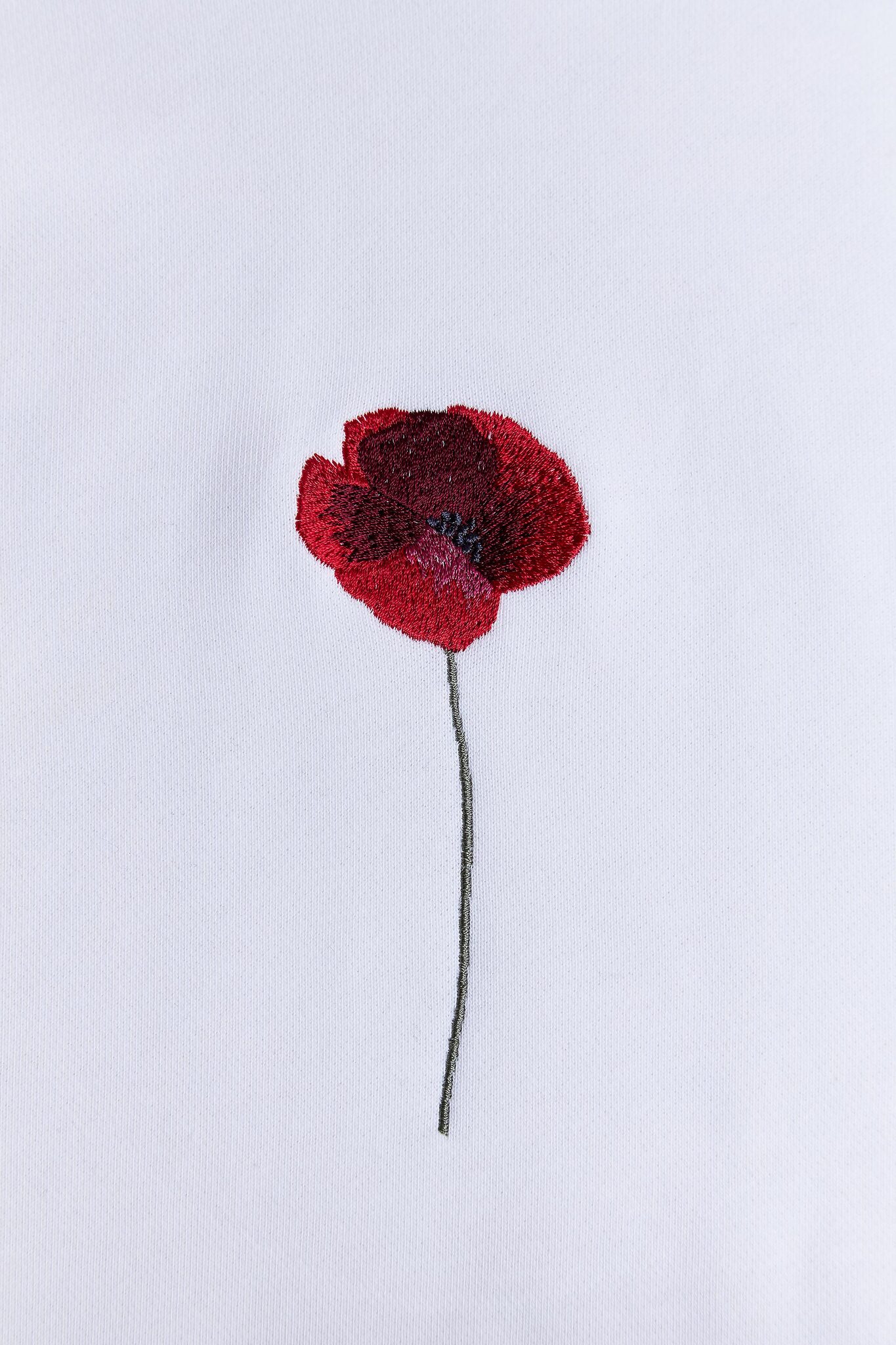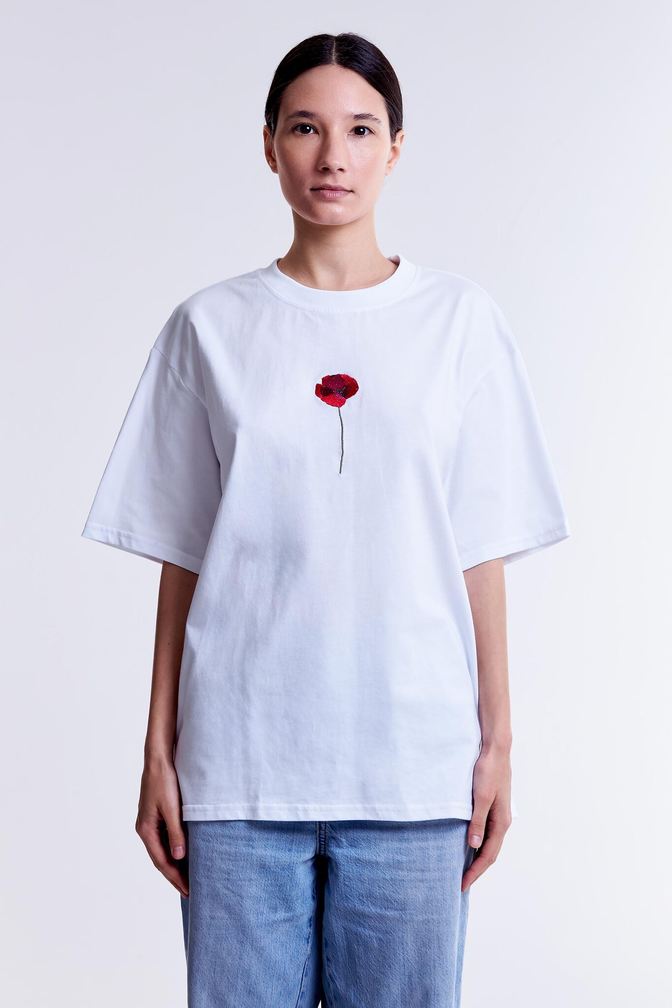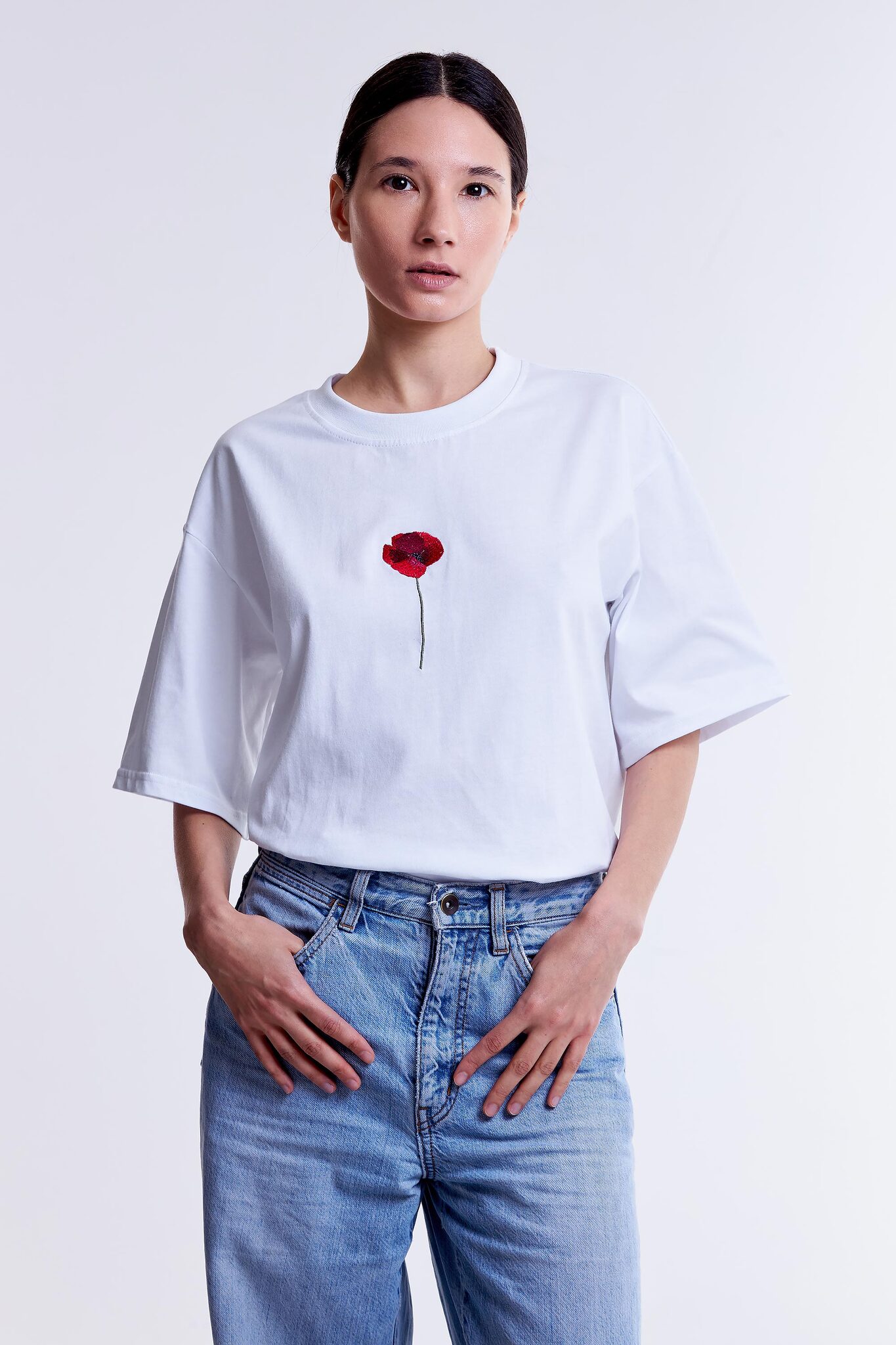 • Круглый вырез, заниженные плечи, прямой крой, вышивка Василек.