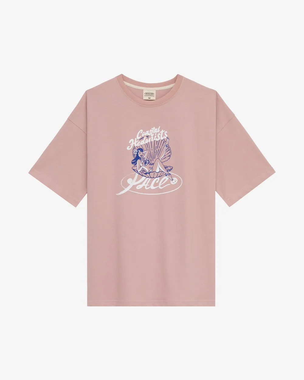 Ткань - хлопок 100%. Легкая футболка пудрового цвета с ярким принтом "Coastal Hedonists" на груди.