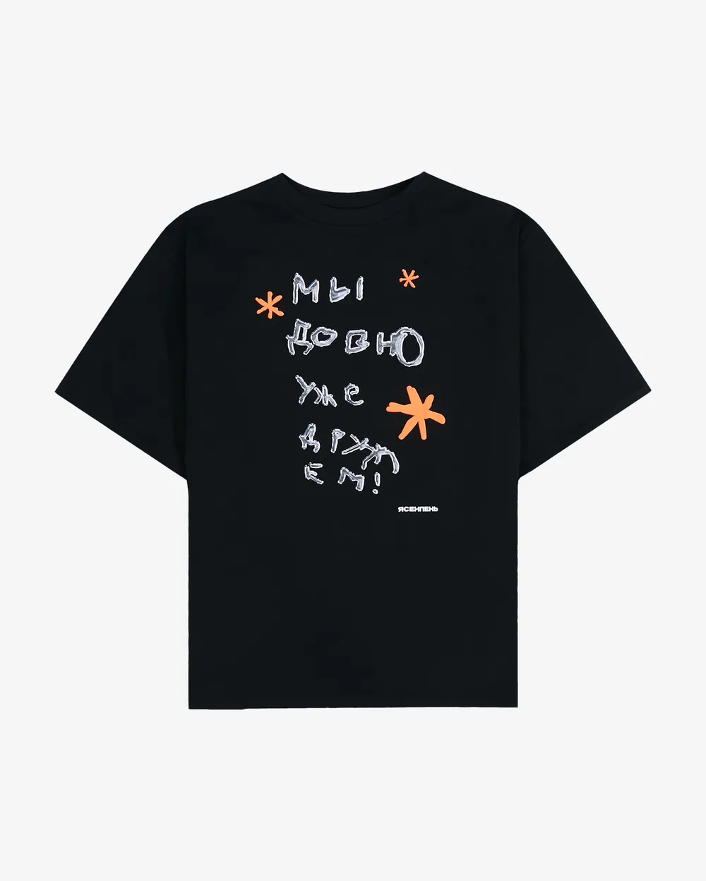 Футболка свободного кроя в чёрном цвете с оригинальными принтами на груди и спине. Выполнена из натурального плотного хлопка, который почти не мнётся даже после стирки.
