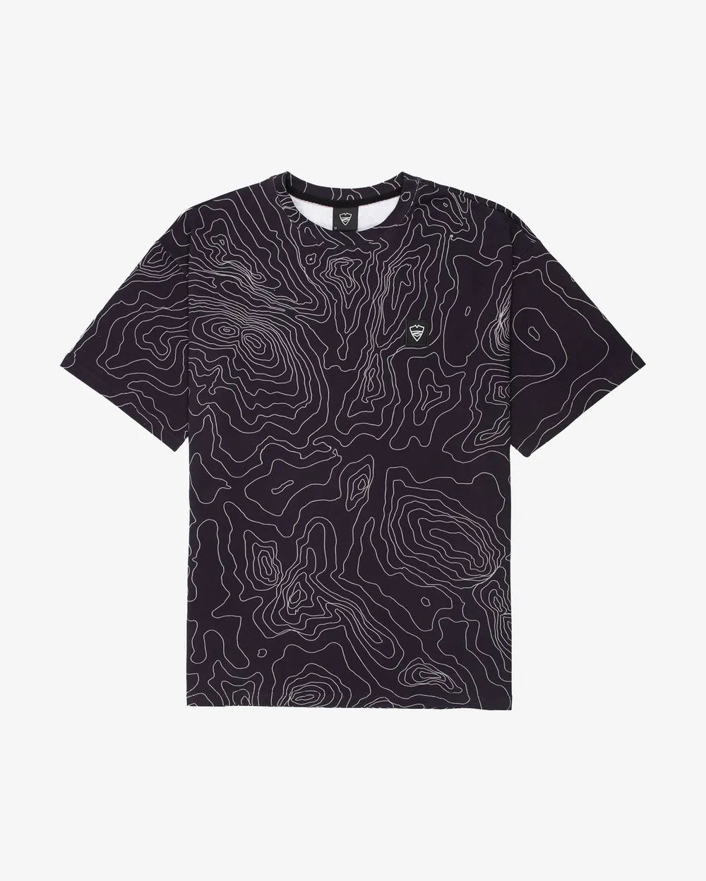 Футболка оверсайз кроя выполнена из плотного хлопка, на груди жаккард с логотипом бренда. В футболках используется «фулл-принт» печать узора, стилизованного под условное обозначение рельефа местности на топографических картах.