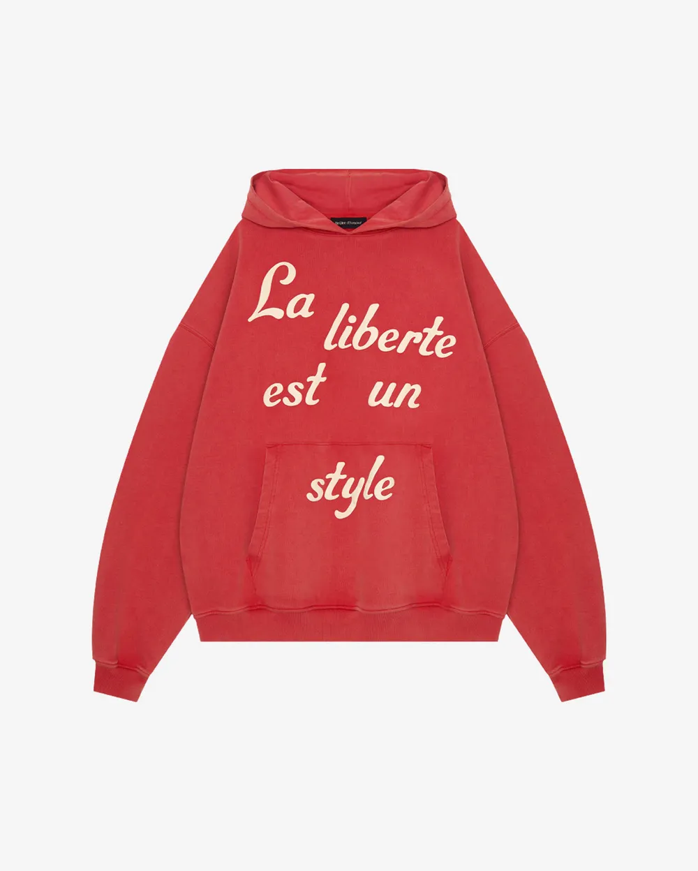 "Temps de Liberté" — худи с манифестом прямо на груди: La liberté est un style — свобода — это стиль. Красный цвет, плотная ткань и свободный силуэт создают уверенный и выразительный образ.