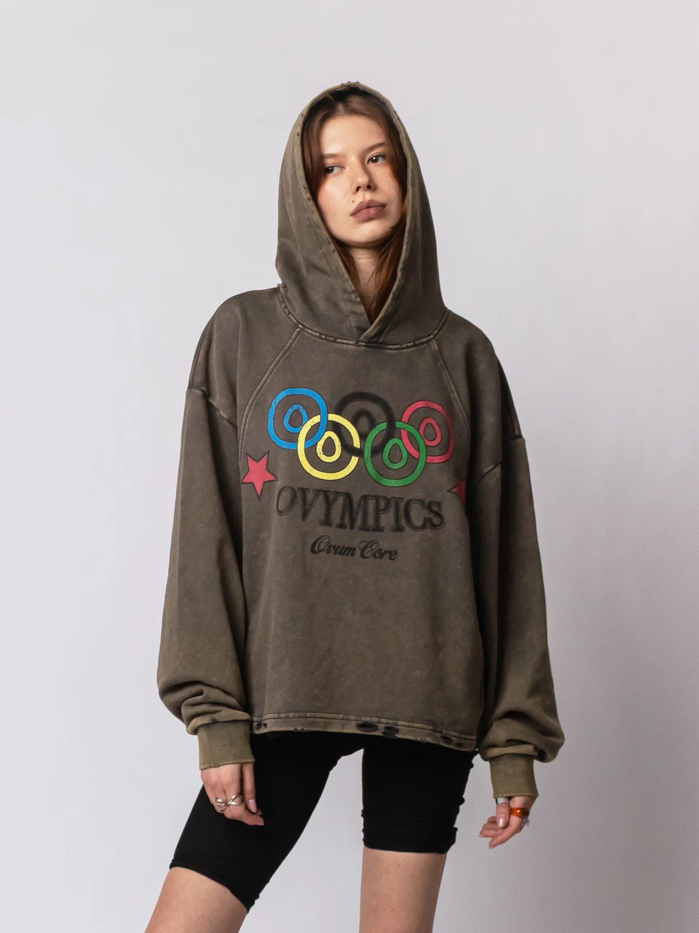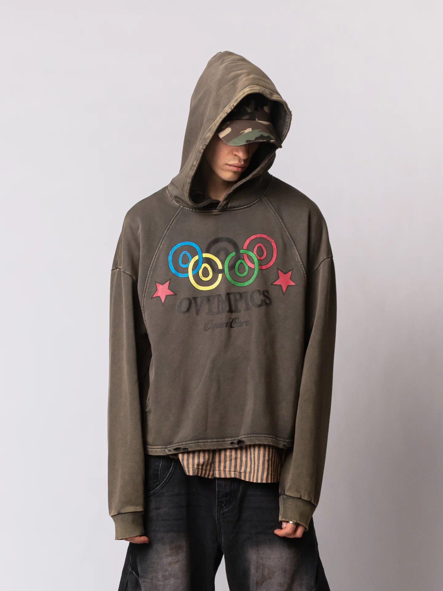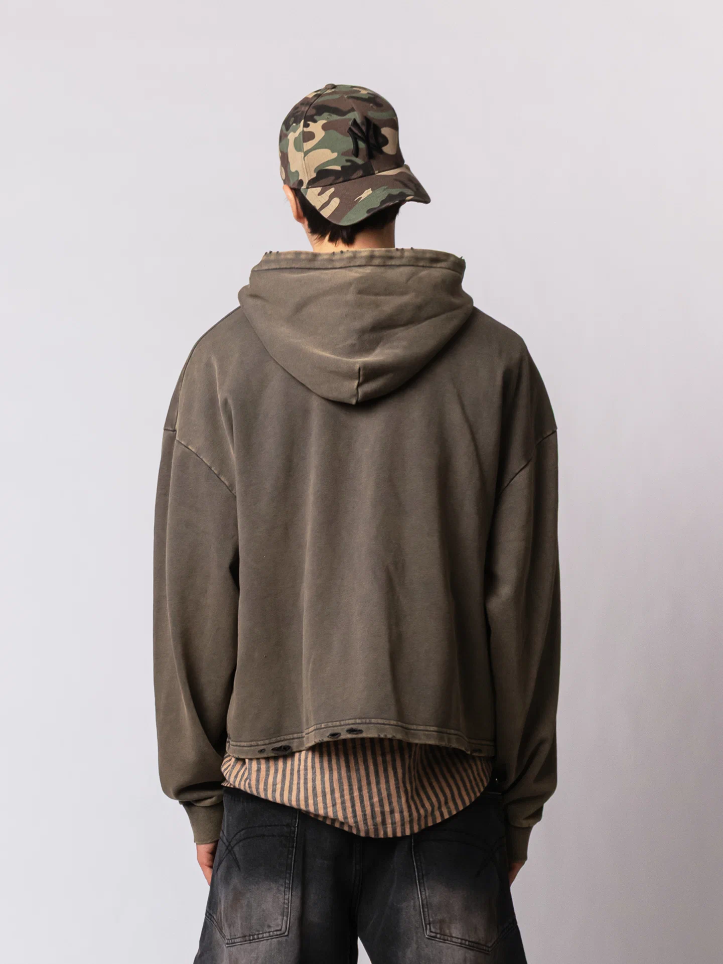 Оверсайз кроп худи из легкого хлопкового футера с выстиранным эффектом и рваными потертостями.