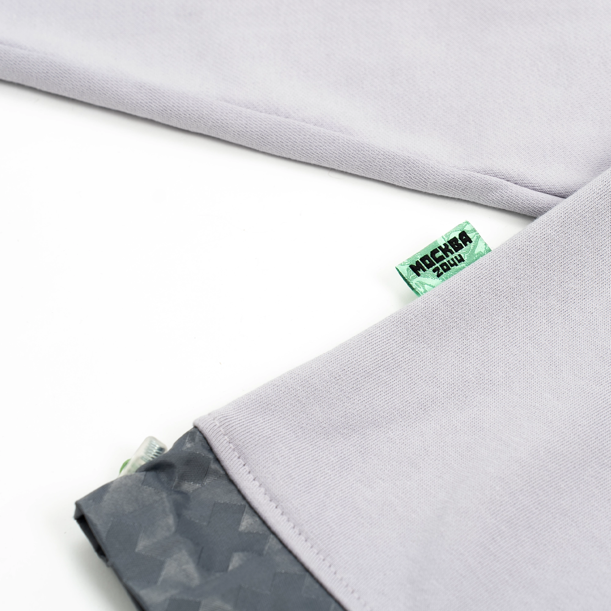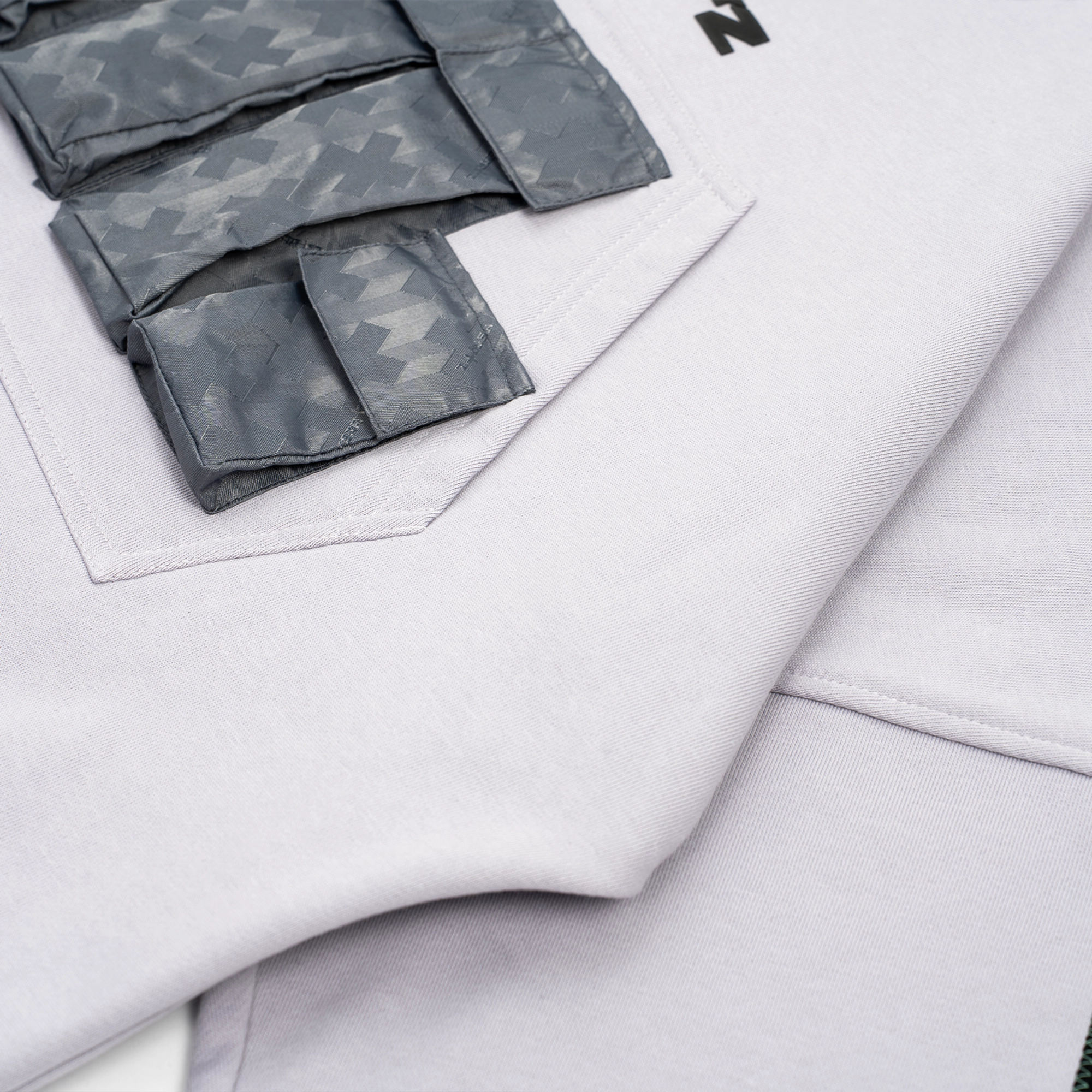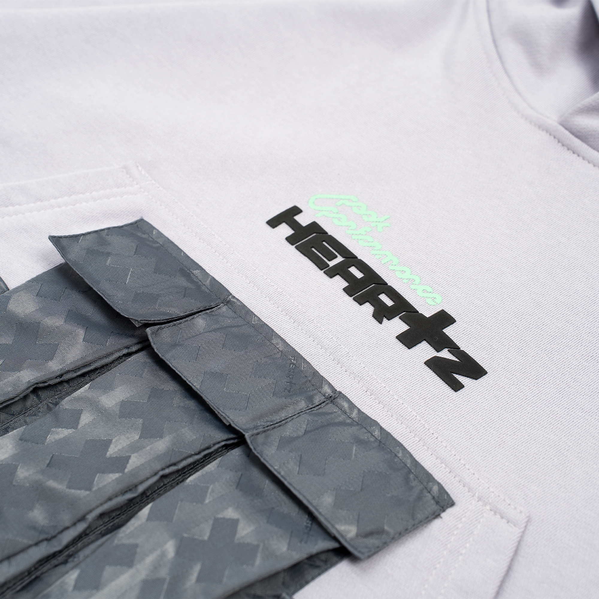 Умеренный crop-fit со спущенным плечом. Холодный серый оттенок с фиалковым отливом и аккуратными акцентами в фирменном цвете #99dead. Основа — 100% хлопок 390 г/м²; функциональные элементы выполнены из нейлона, сотканного жаккардом в фирменном паттерне.