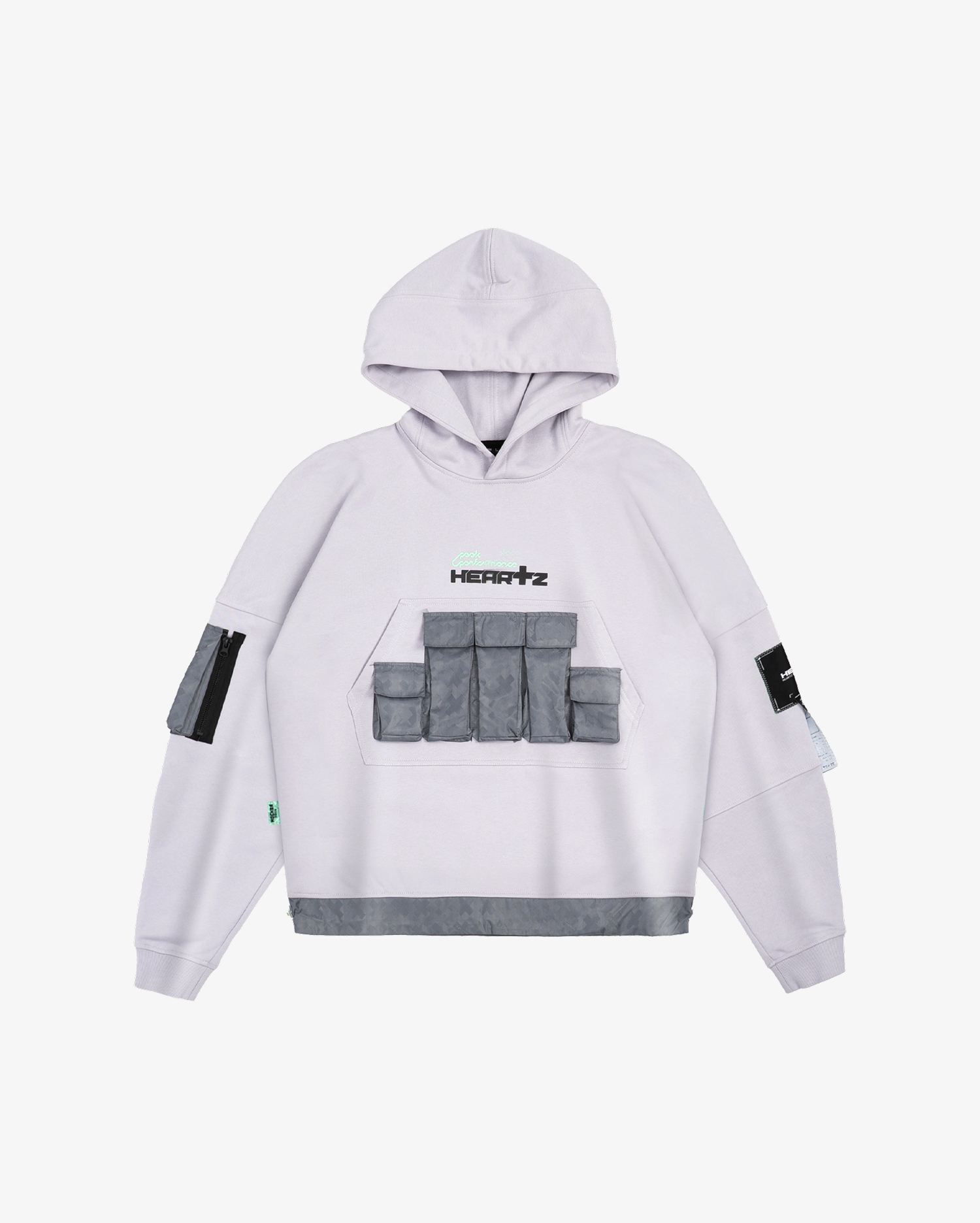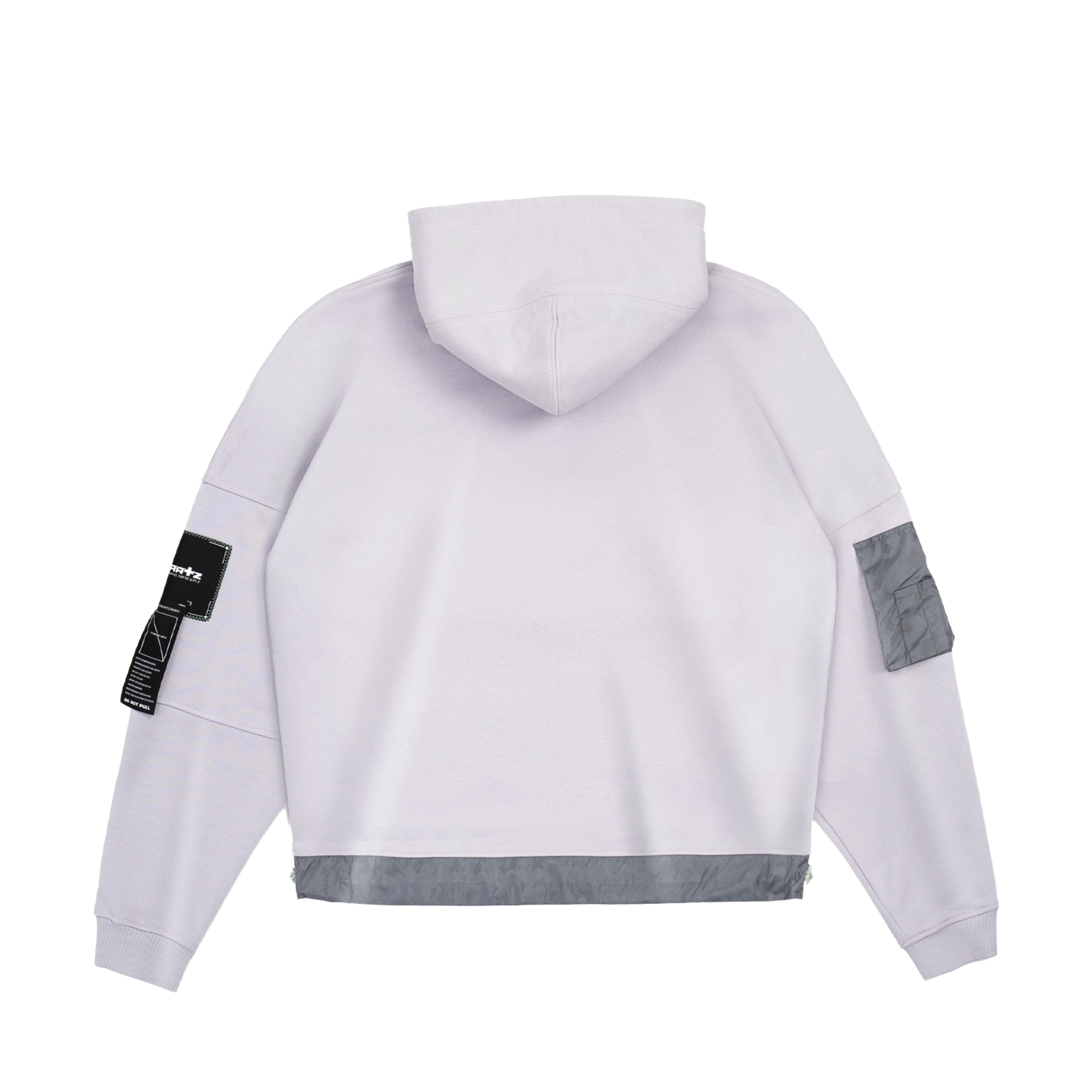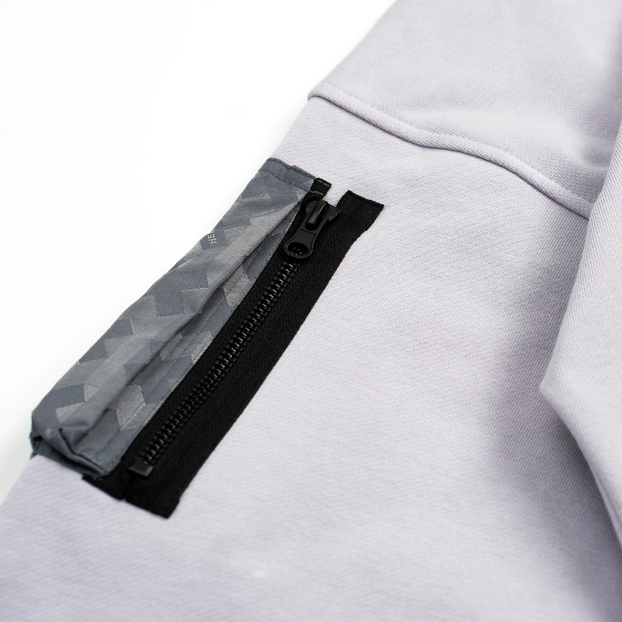 Умеренный crop-fit со спущенным плечом. Холодный серый оттенок с фиалковым отливом и аккуратными акцентами в фирменном цвете #99dead. Основа — 100% хлопок 390 г/м²; функциональные элементы выполнены из нейлона, сотканного жаккардом в фирменном паттерне.