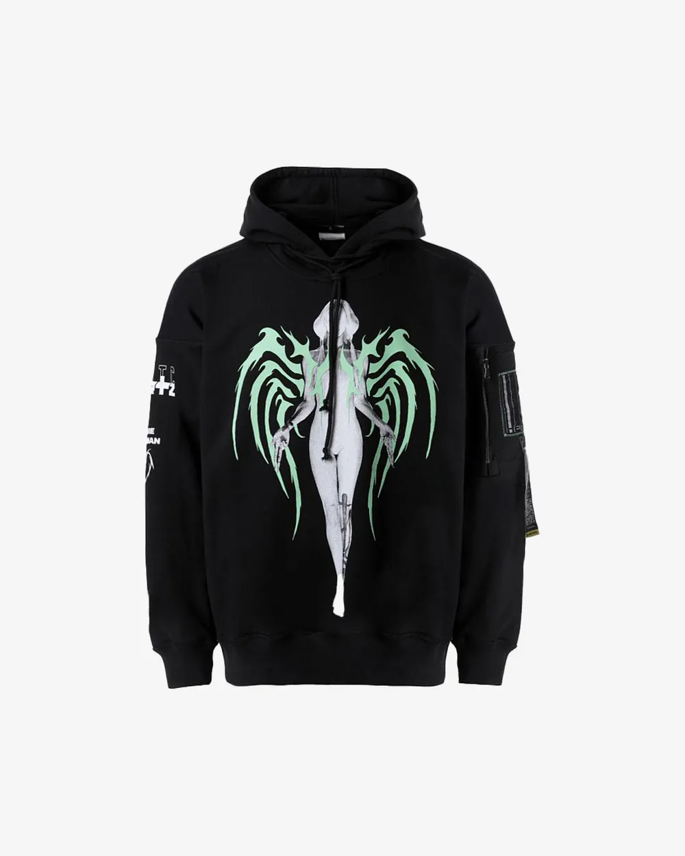Флагман коллекции «Amare Guardian». Идейная противоположность Distressed Hoodie. Особая конструкция шнура, который обматывается вокруг шее закрепляясь через петли на спине. Тактический карман на металлической молнии на плече. Составной принт в фирменный цветах бренда - основной силуэт выполнен шелкографией, а расправленные крылья имеют подъем, добавляя как визуальный, так и тактильный объем. 100% хлопок. Наша фирменная оверсайз посадка со спущенным плечом. Широкая размерная сетка на любой рост и телосложение. Комплект поставки - коллекционные стикеры, силиконовая бирка-брелок, брендированная упаковка.
