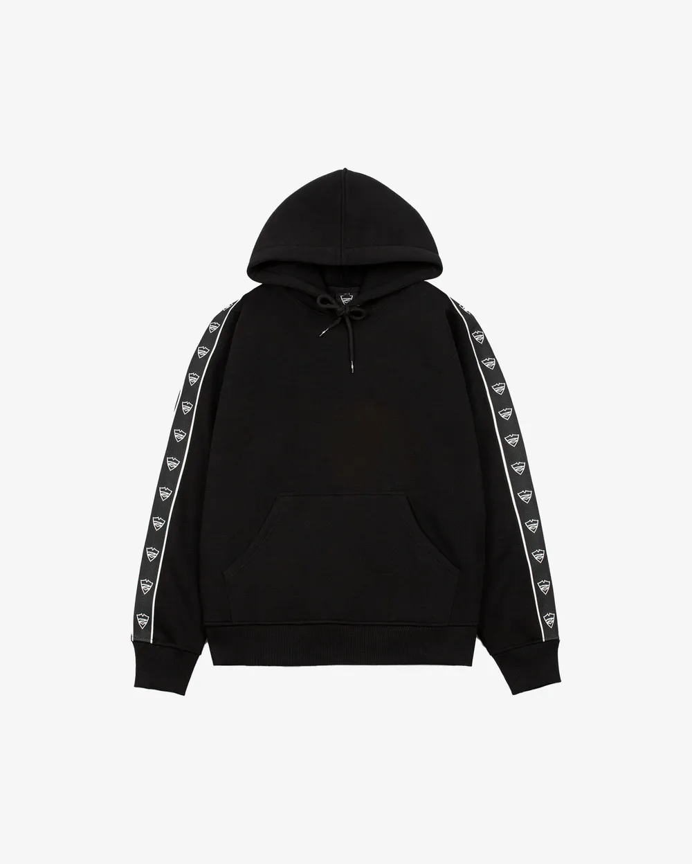 Худи классического кроя выполнено из футера с начёсом. На рукавах изделия расположен лампас с логотипами бренда.