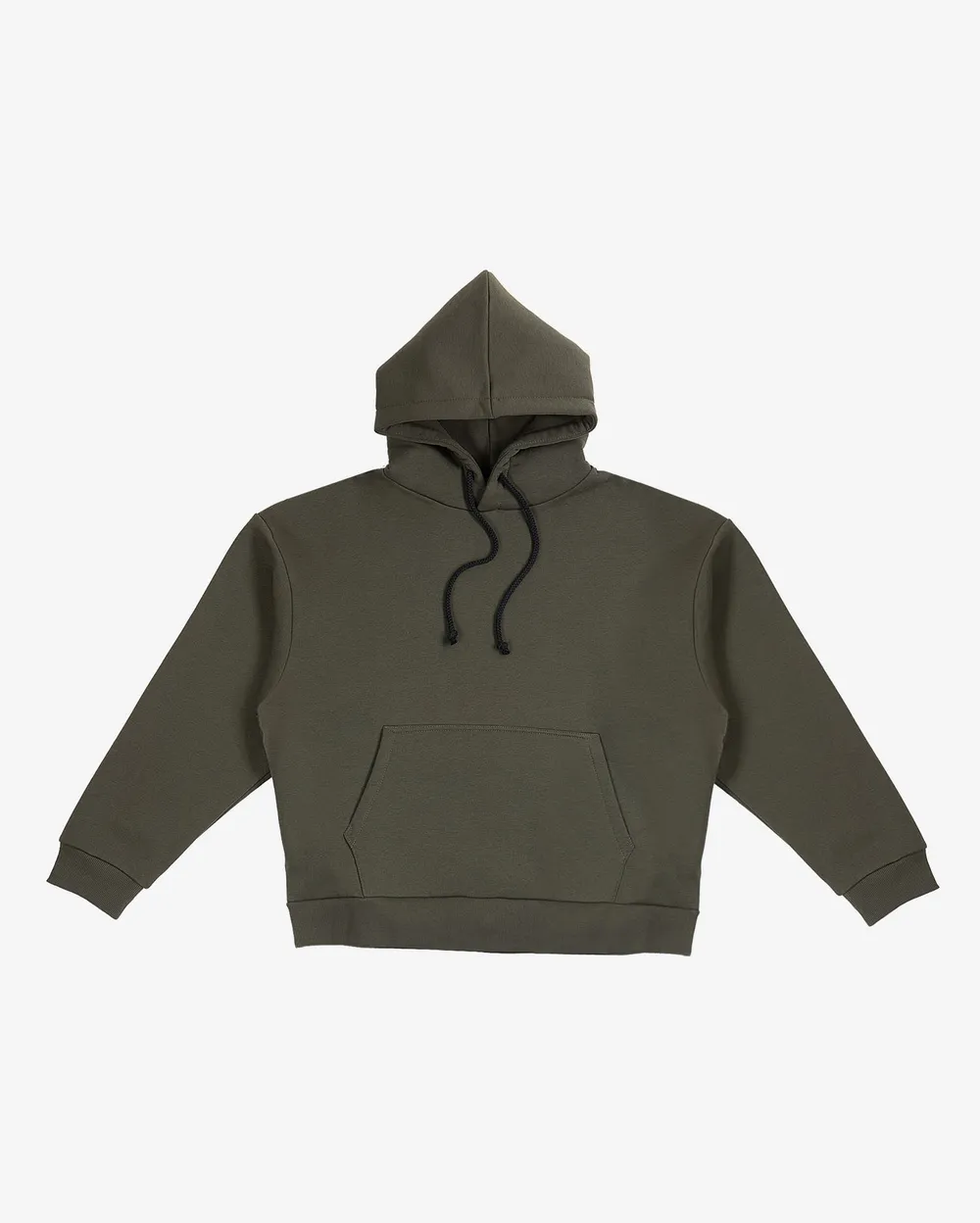 Бланковая худи оверсайз цвета хаки с заниженным втачным рукавом, двумя потайными карманами и скрытой регулируемой резинкой внизу.