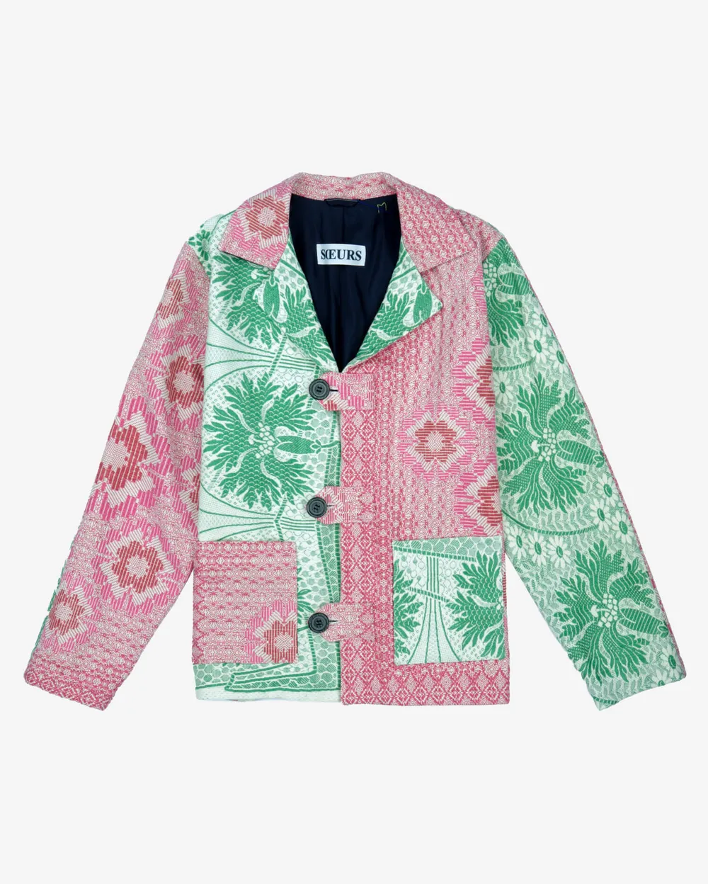 Куртка сшита в одном экземпляре из двух покрывала, периода 1980х годов. Слегка клешеный крой. Три крупные застежки.