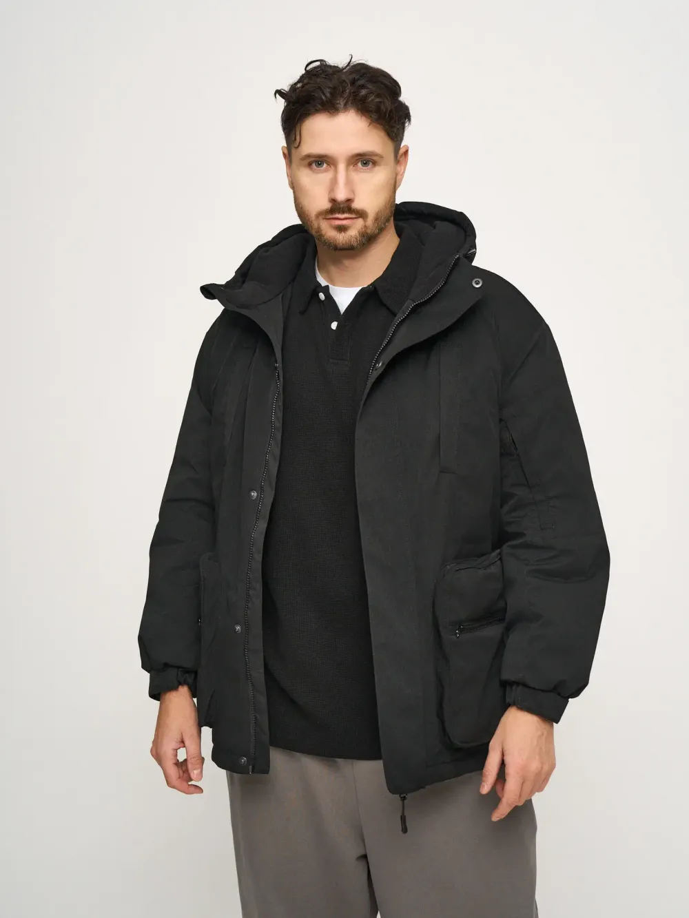 Зимняя мужская куртка с объемными карманами Эта стильная зимняя куртка в черном цвете с выразительными карманами выполнена из приятной на ощупь ткани с саржевым переплетением и бархатистой фактурой, создающей эффект peach skin. В составе ткани присутствует нейлоновая нить, что обеспечивает высокую прочность готового изделия. Куртка обеспечивает превосходную защиту от ветра и влаги, а флисовая подкладка в карманах, на спине и капюшоне сохраняет тепло и комфорт в морозные дни. Куртка выдерживает температуру до -25 градусов Цельсия.