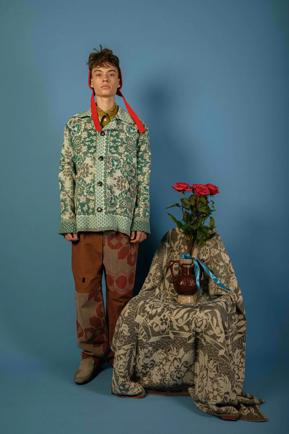 Куртка с отложным воротником и длинными рукавами сшита в одном экземпляре из антикварного покрывала, периода 1970х годов.