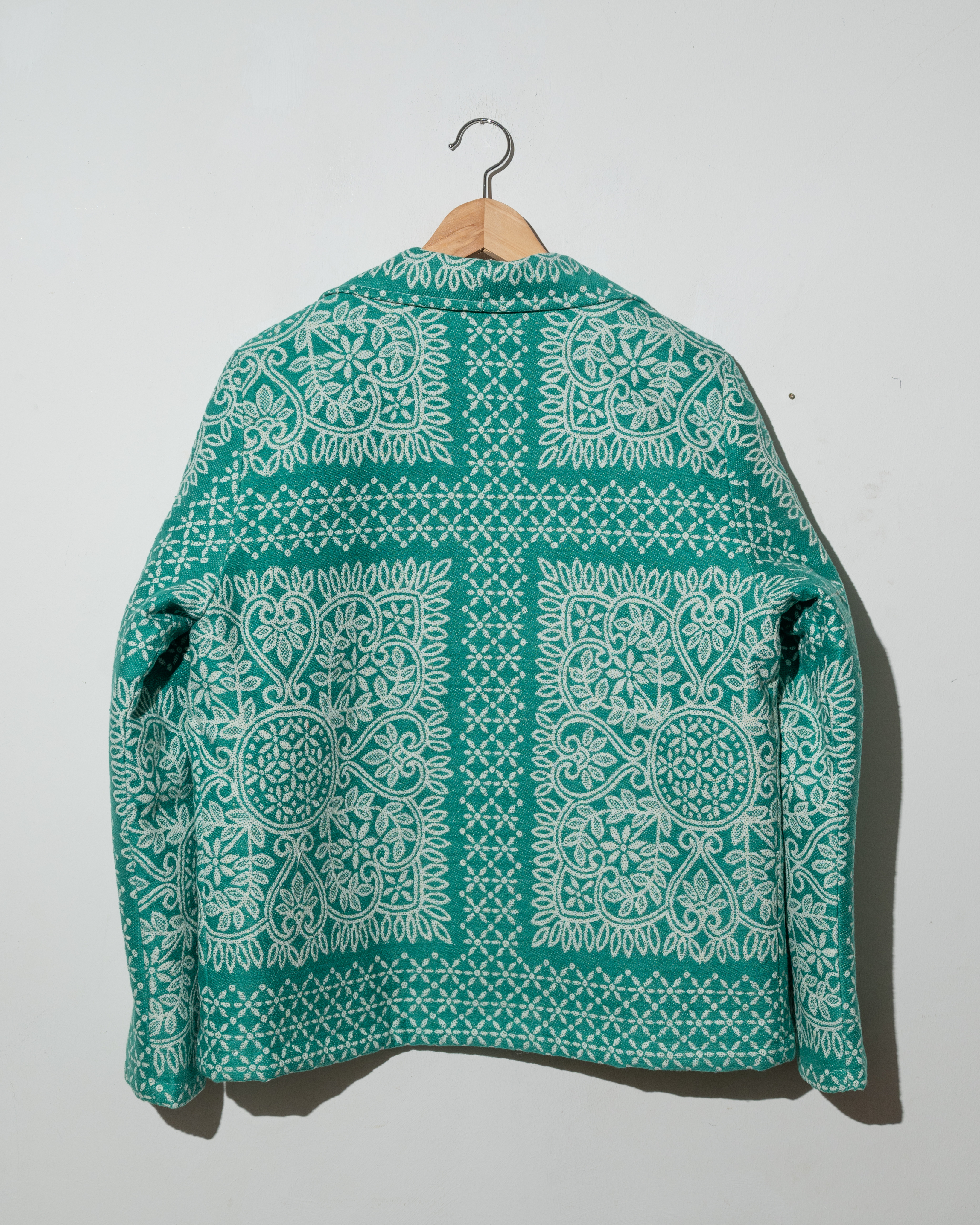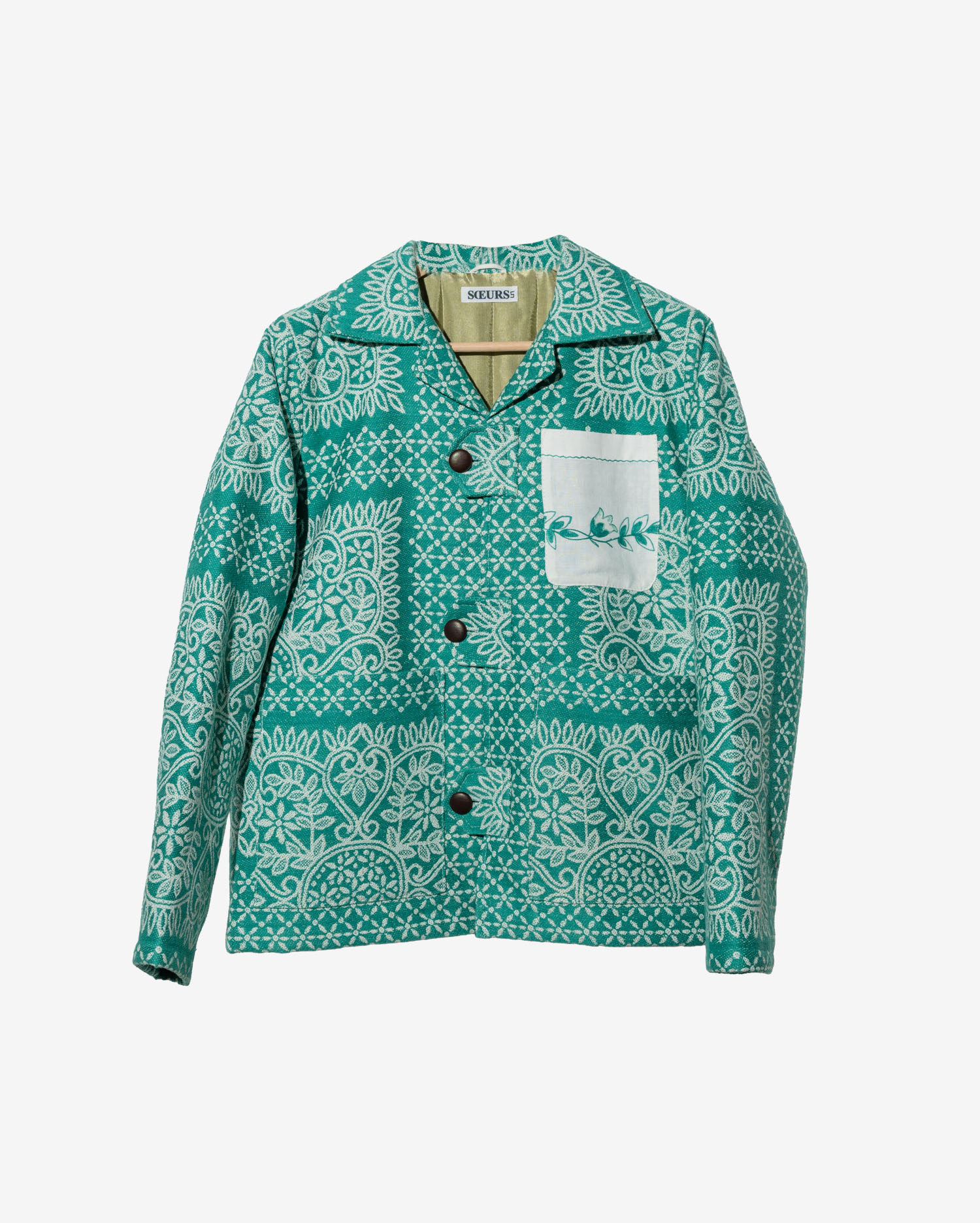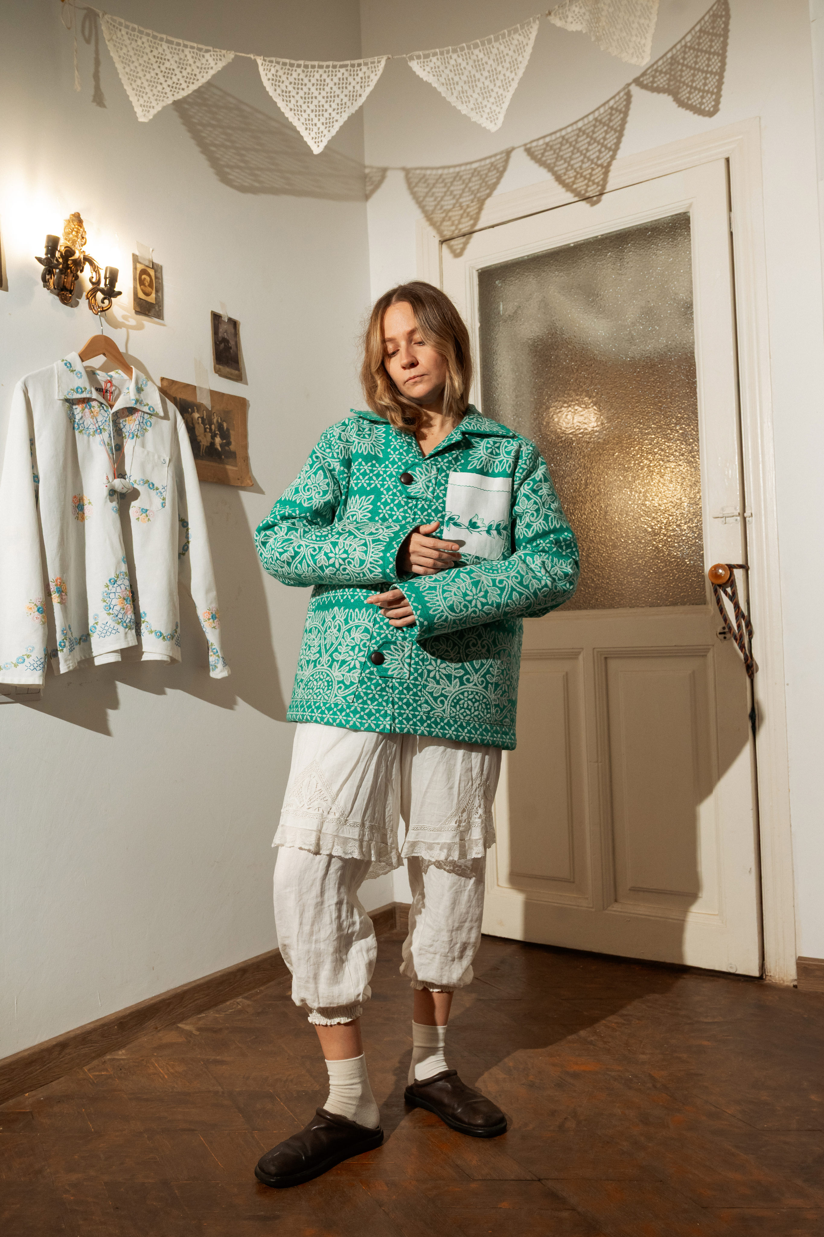 Утепленная Куртка сшита в одном экземпляре из антикварного хлопкового покрывала (100% хлопок) с растительным повторяющимся узором, периода 1970х годов. Маленький карман выполнен из хлопковой скатерти с вышивкой.