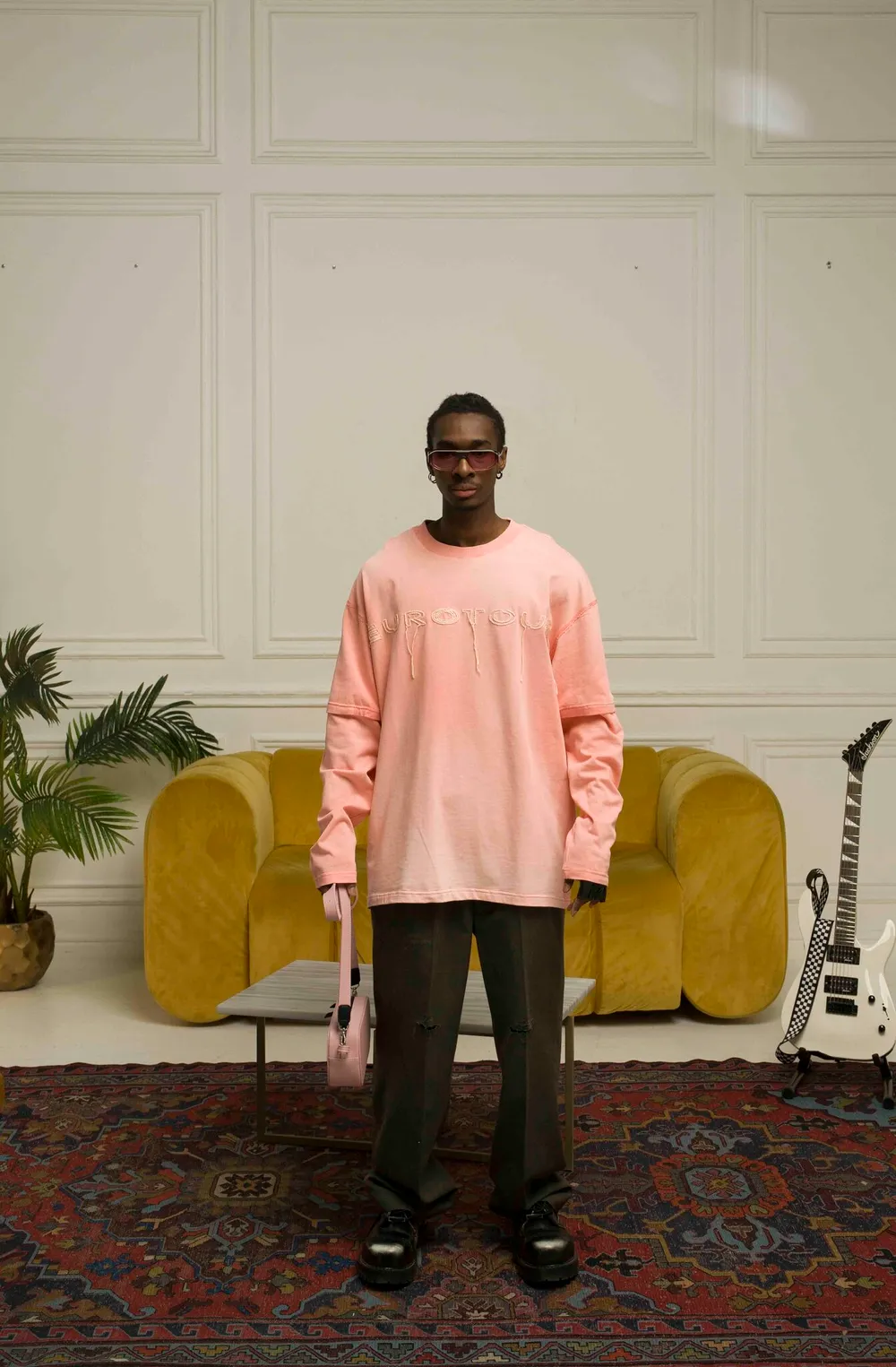 Винтажный лонгслив с выгоревшим эффектом и принтом на спине. Имеет вышивки на груди и в нижней части изделия