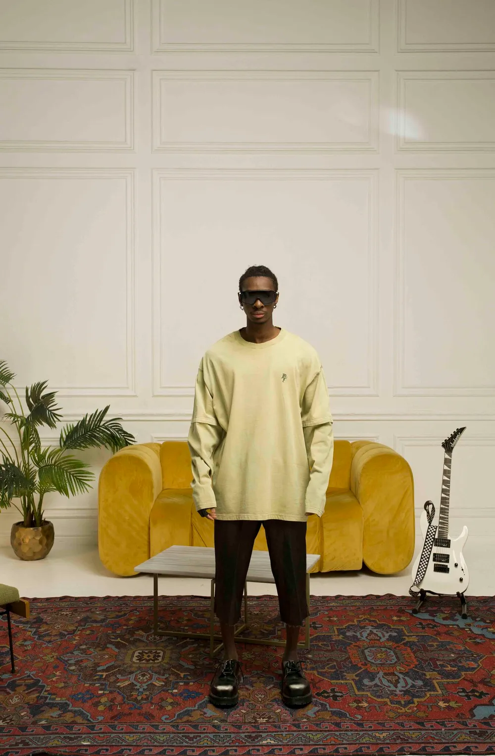 Винтажный лонгслив с выгоревшим эффектом и принтом на спине. Имеет вышивки на груди и в нижней части изделия