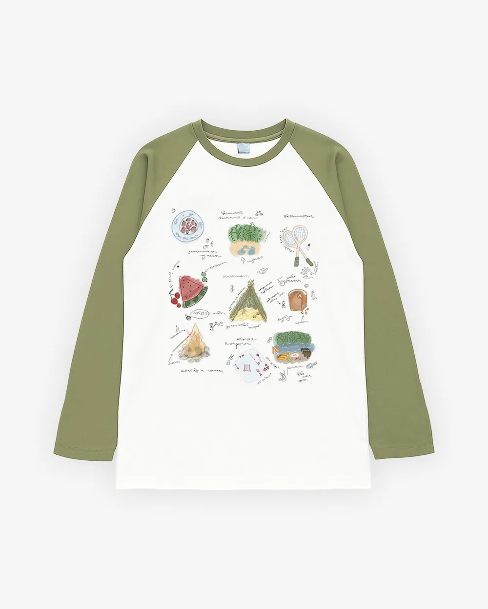 Белый лонгслив с рукавами реглан оливкового цвета и принтом.