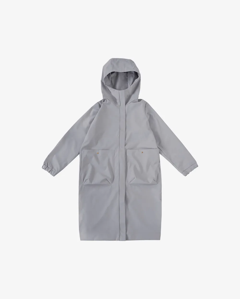 непромокаемый (за счёт специальной ткани с прорезиненной изнаночной стороной), при этом дышащий и подмышками мы ещё дополнительно установили по 2 люверса для вентиляции :)