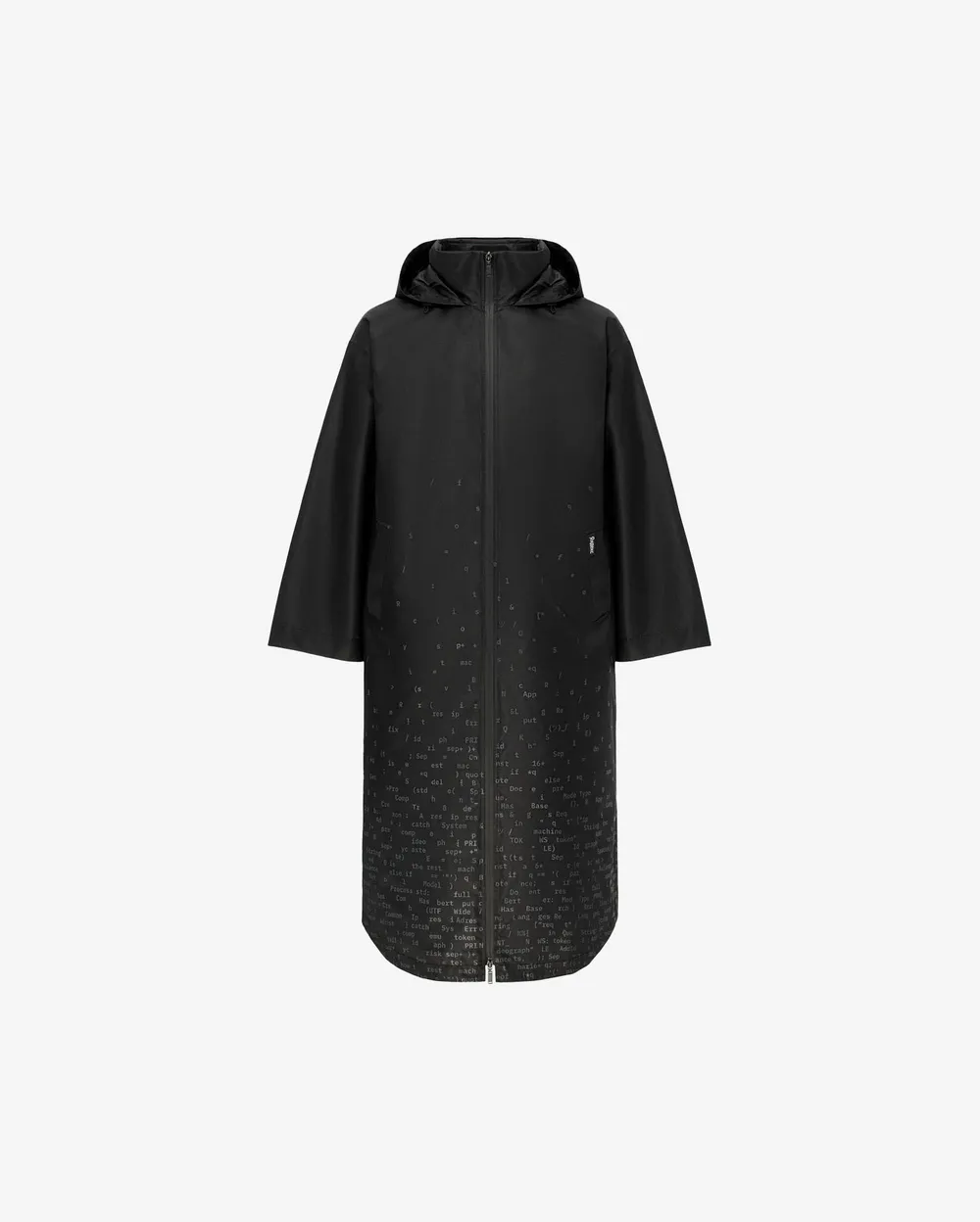 Лаконичный силуэт с принтом кода, который напечатан шелкографией, напоминает дождевые капли, стекающие по стеклу. Защищает от ветра: капюшон с завязками можно убрать в высокий воротник, который в застёгнутом виде закрывает горло.