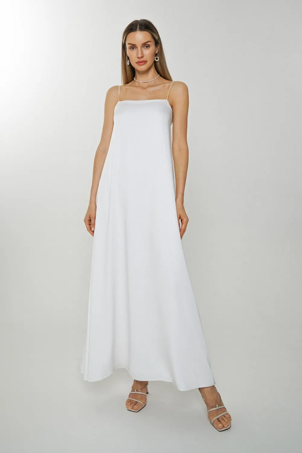 Платье-комбинация А-силуэта свободного кроя на тонких бретелях выполнено из легкой ткани Бамбук с подкладкой из смесовой ткани. Застежка сзади на потайную молнию. Для создания образа можно скомплектовать с соответствующей блузкой из капсулы.