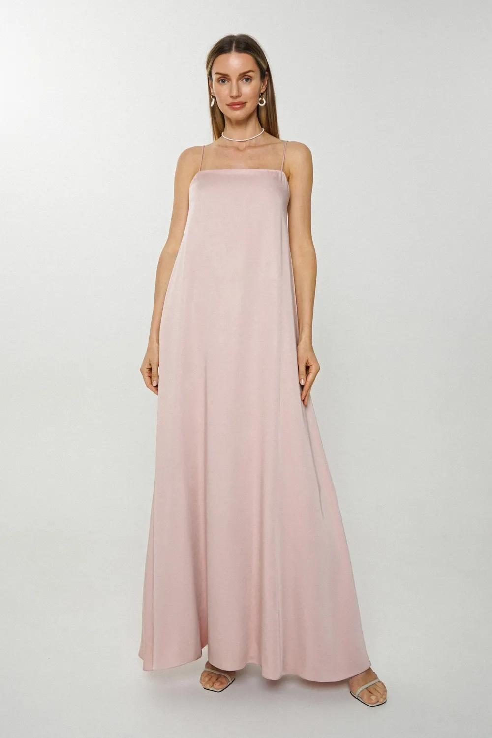 Платье-комбинация А-силуэта свободного кроя на тонких бретелях выполнено из легкой ткани Бамбук с подкладкой из смесовой ткани. Застежка сзади на потайную молнию. Для создания образа можно скомплектовать с соответствующей блузкой из капсулы.