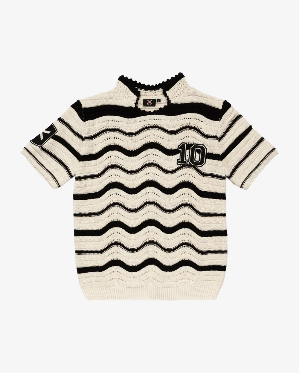 Поло в стиле в стиле ретро-футбольной джерси, выполненное в мягкой вязке с плавной волной в чёрно-молочных тонах. Широкий рисунок, крупный номер 10 на груди и нашивка на рукаве создают динамичный, выразительный образ. Идеально для тех, кто ценит стиль, историю и детализацию в повседневном гардеробе.