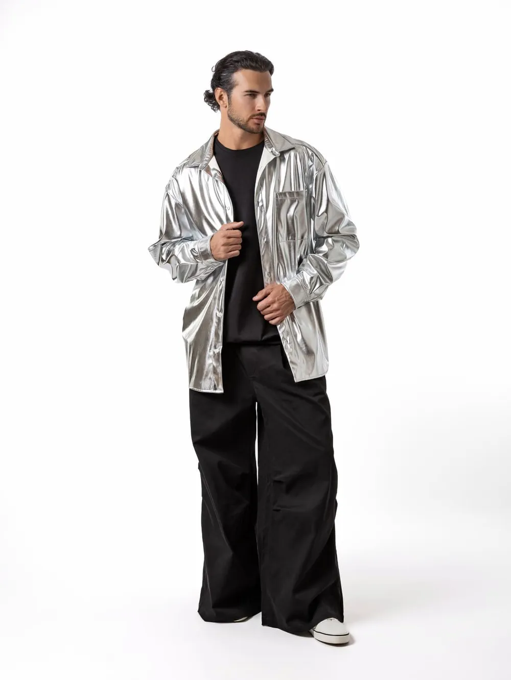 Рубашка из эко-кожи прямого кроя, среднего объема, с спущенной линией плеча без подкладки и с накладным карманом на груди.