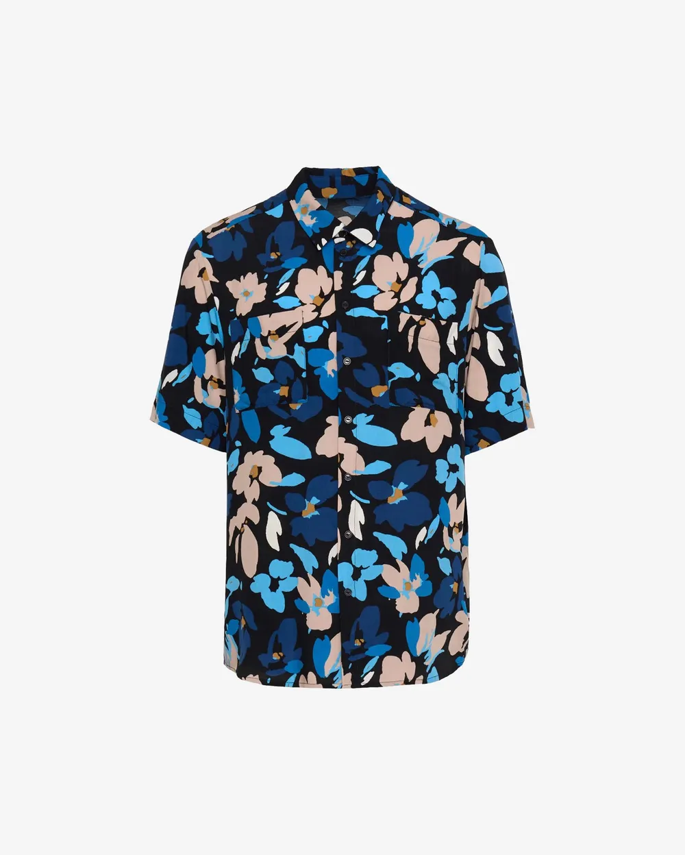 Свободная черная рубашка с ярко-синим принтом в виде крупных цветов станет акцентом образе. Тонкая 100% вискоза обеспечит комфорт в жаркую погоду. Рубашку можно носить навыпуск — к примеру, с шортами или брюками чинос и любимой футболкой, оставив пуговицы расстегнутыми: благодаря переплетению интерлок с изнанки ткань выглядит так же, как и с лицевой стороны.