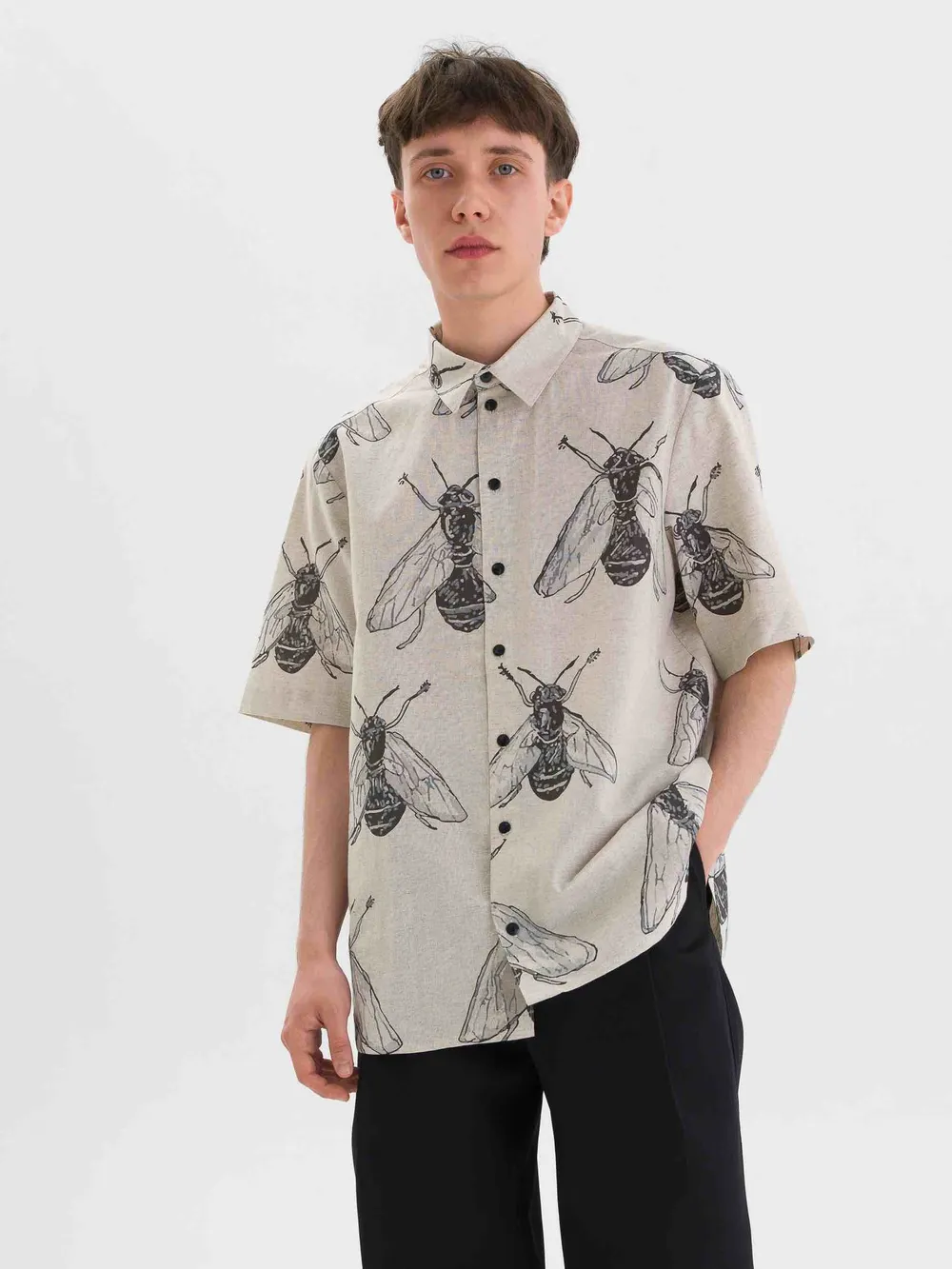 Рубашка из приятного телу полульна с принтом. Полульняная хлопковая ткань, прямой крой, короткий рукав, классический воротник.