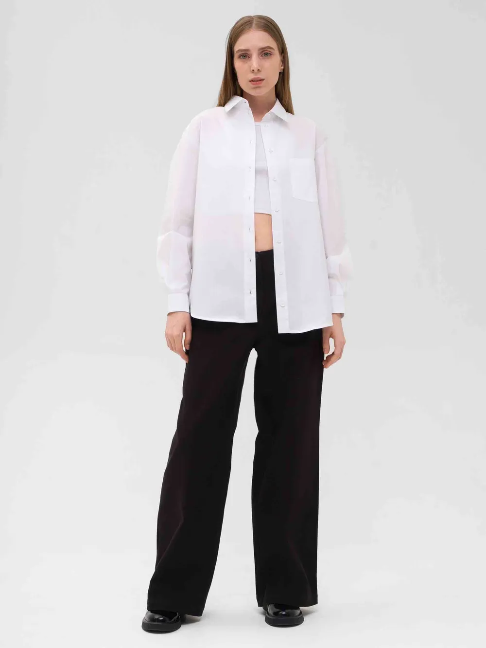 Базовая белая рубашка с длинными рукавами и карманом на груди. Хлопковая ткань, прямой крой, классический воротник.