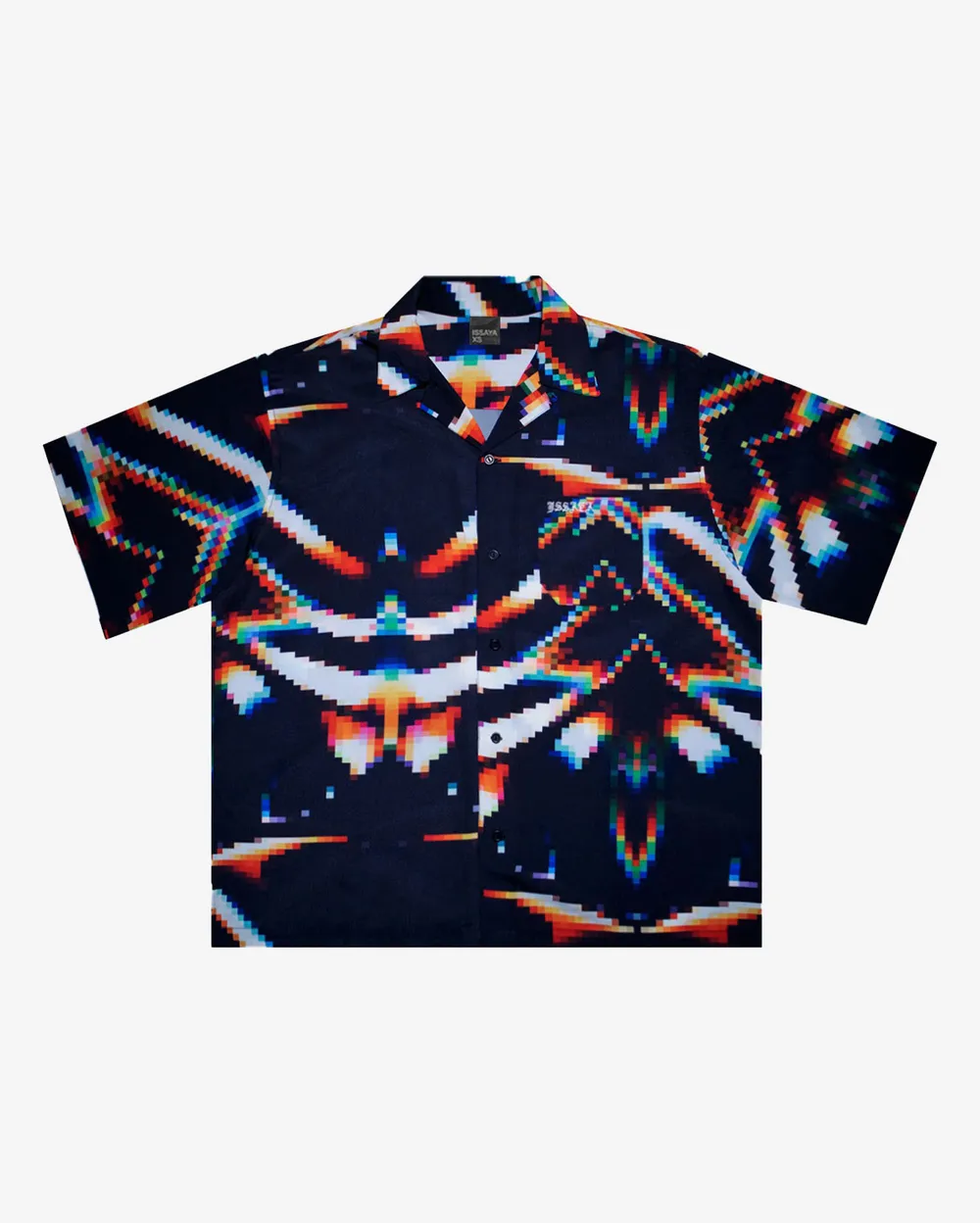 Рубашка выполнена из легкой смесовой ткани: быстросохнущая, практически не мнется. Цифровая печать. Оверсайз фит. Матовые пуговицы. Брендинг в виде вышивки.