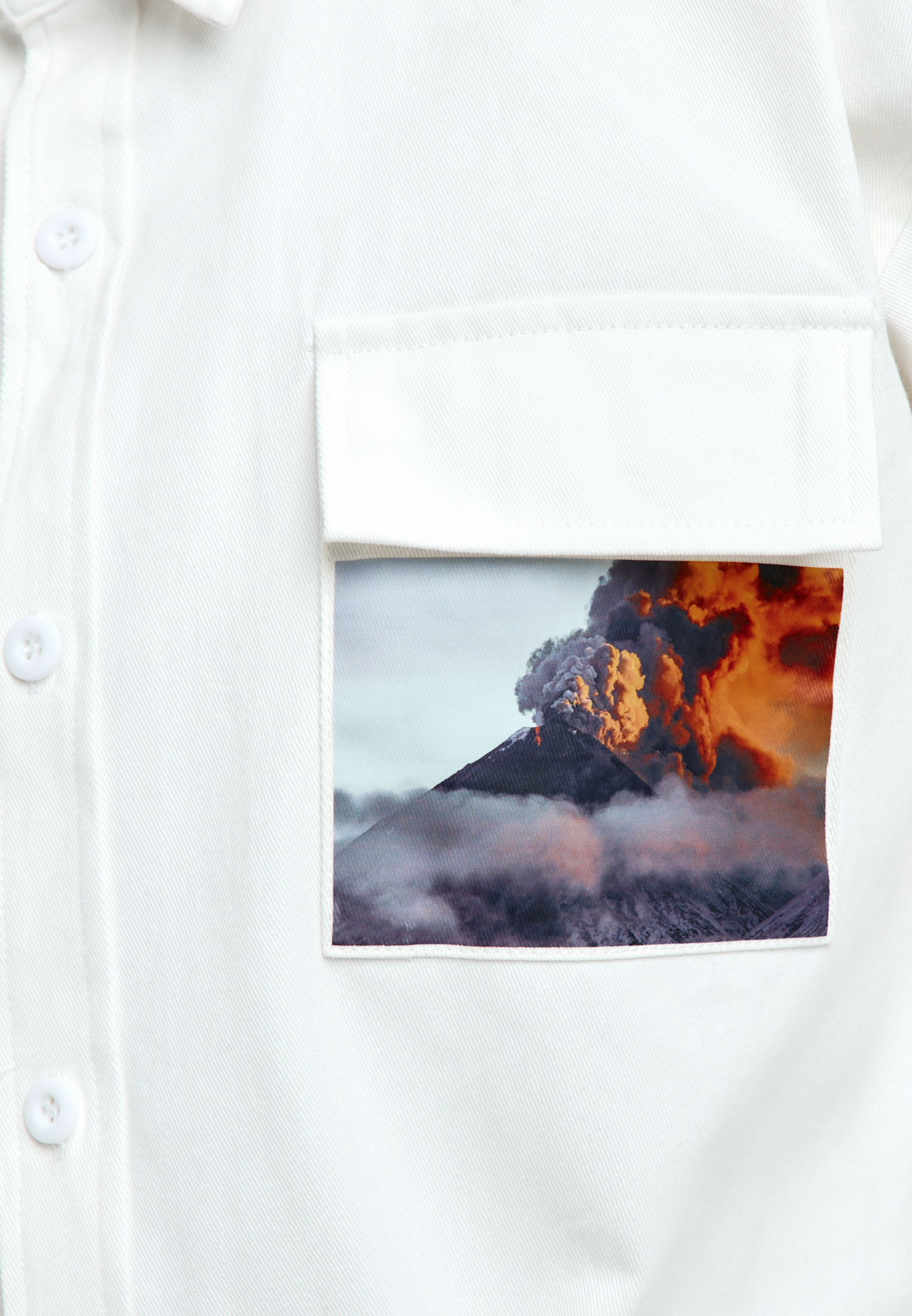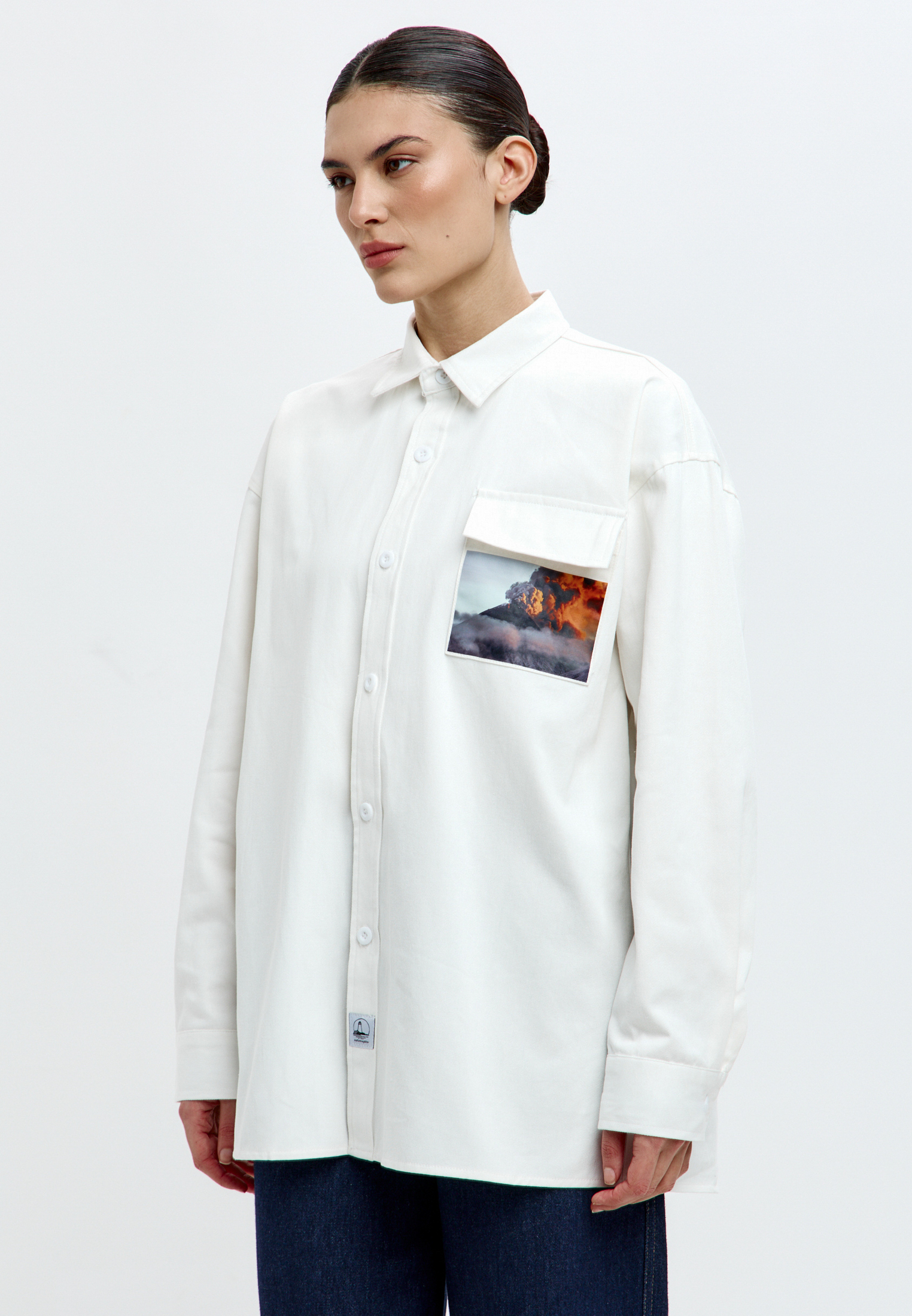 Лимитированная коллекция «Камчатка» создана совместно камчатским фотографом Еленой Сафоновой. Свободная рубашка из плотного хлопка простого дизайна с отложным треугольным воротником и крупным нагрудным карманом. Объемные рукава имеют широкие манжеты. Рубашка застегивается на пуговицы в тон основного материала. Подходит для самостоятельной носки, либо в качестве верхнего слоя для майки или футболки.
