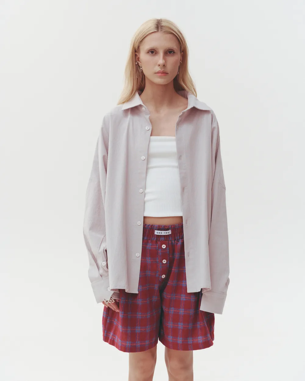Минималистичная базовая рубашка из хлопка в оверсайз силуэте. Без карманов, с флажком на кокетке и перламутровыми пуговицами с гравировкой. В ткани есть вкрапления цветных ниток — это не брак.