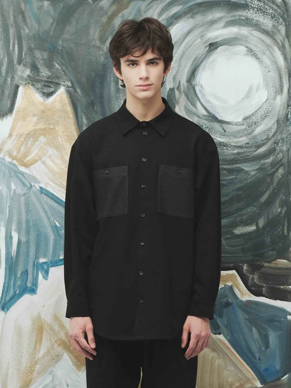 Рубашка пэчворк из плотной ткани черного цвета и денима.