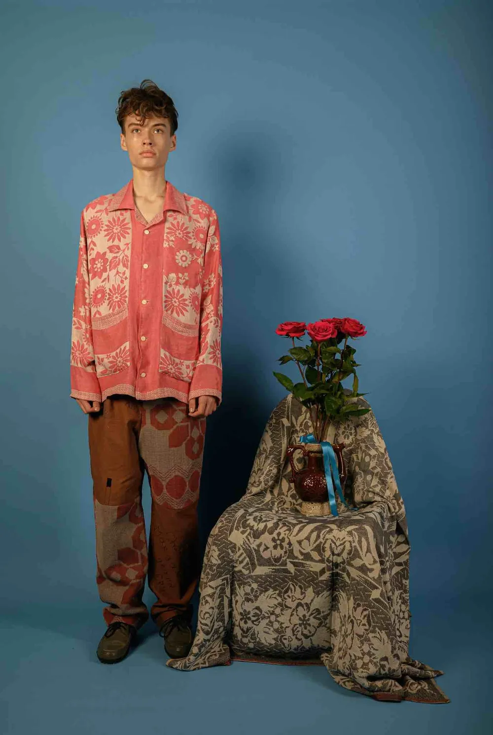 Рубашка с отложным воротником и длинными рукавами сшита в одном экземпляре из антикварной скатерти, периода 1980х годов.