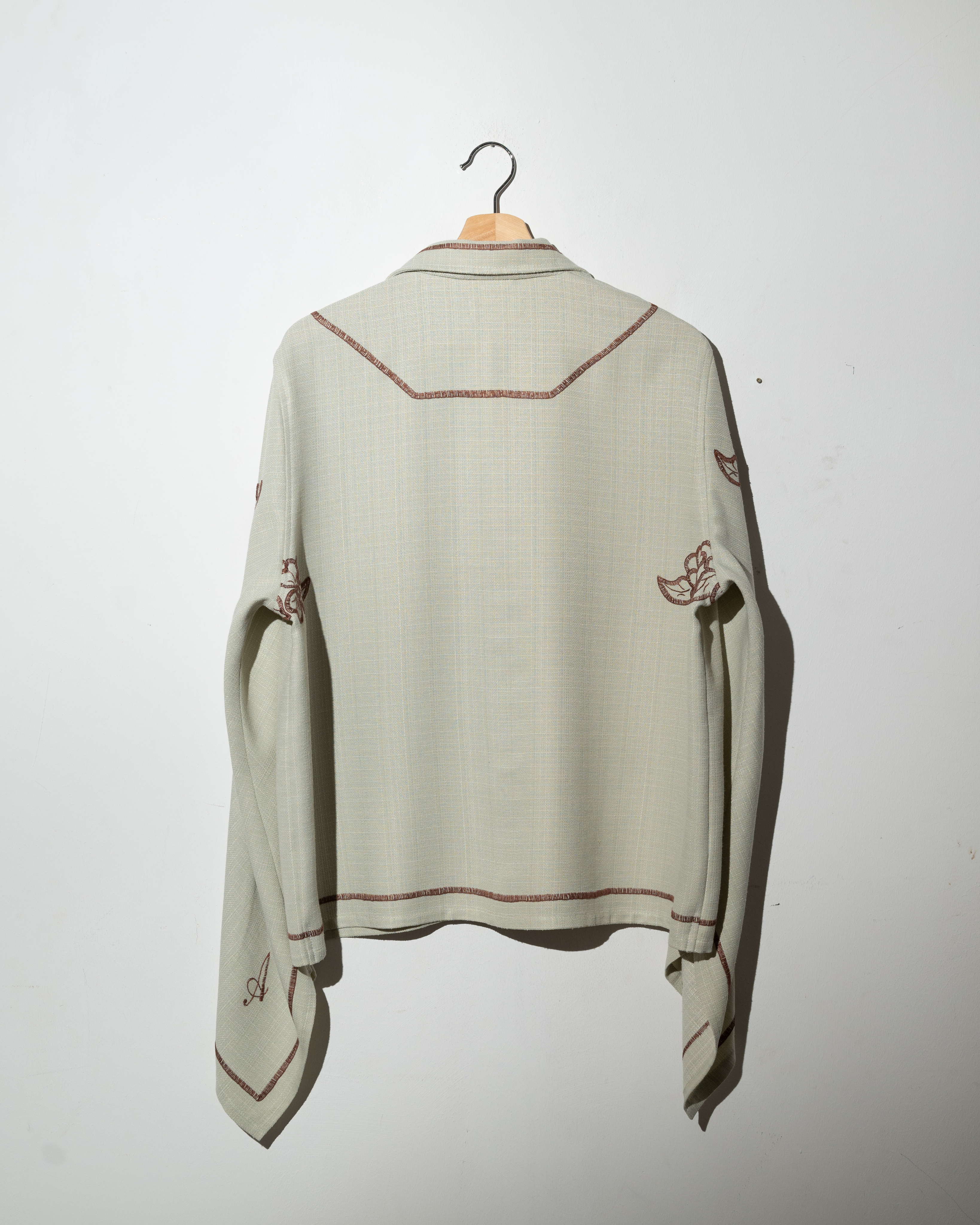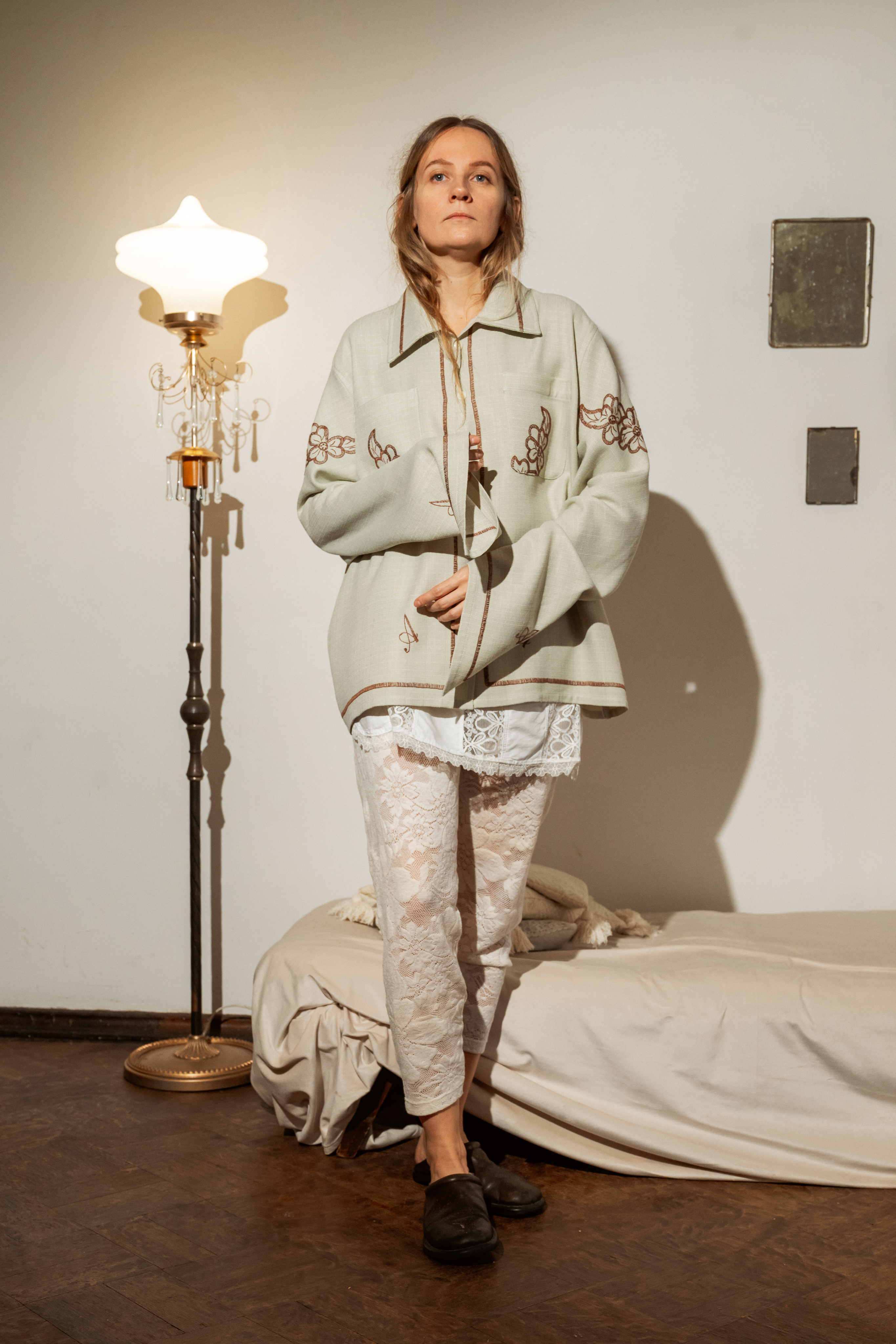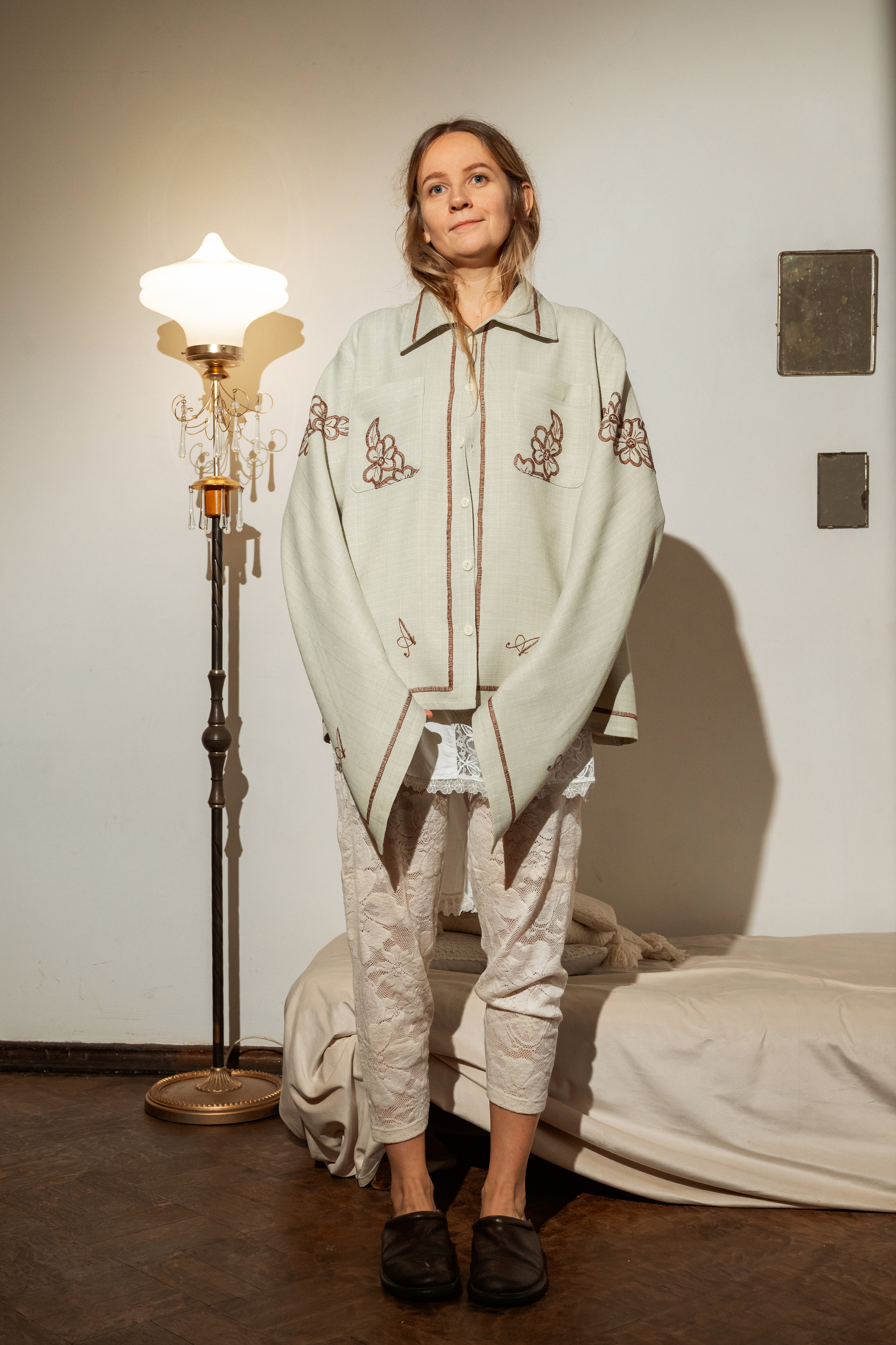 Рубашка с длинными рукавами сшита в одном экземпляре из антикварной скатерти (полиэстер 50%, хлопок 50%), периода 1960х годов. Скатерть украшена вышивкой.