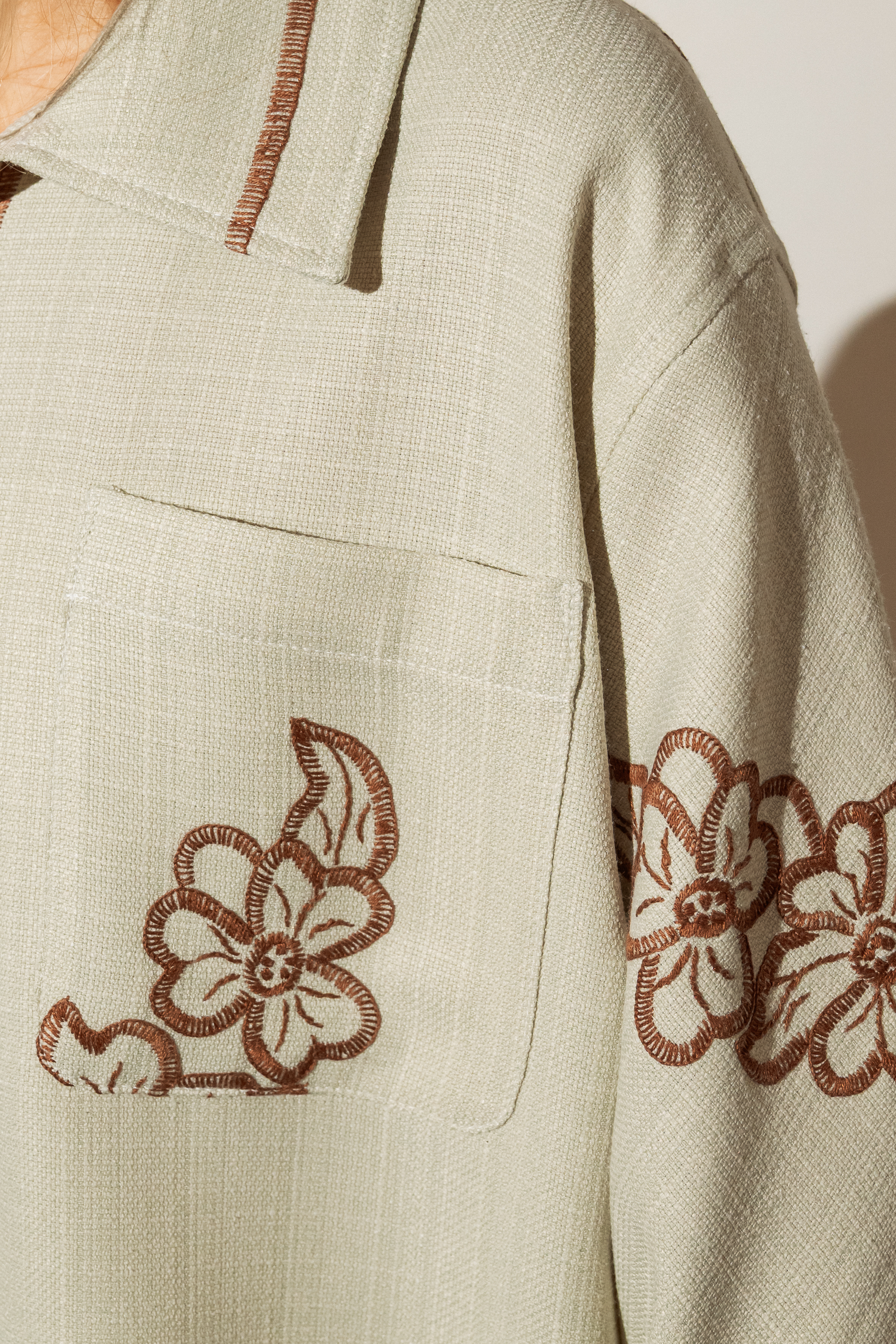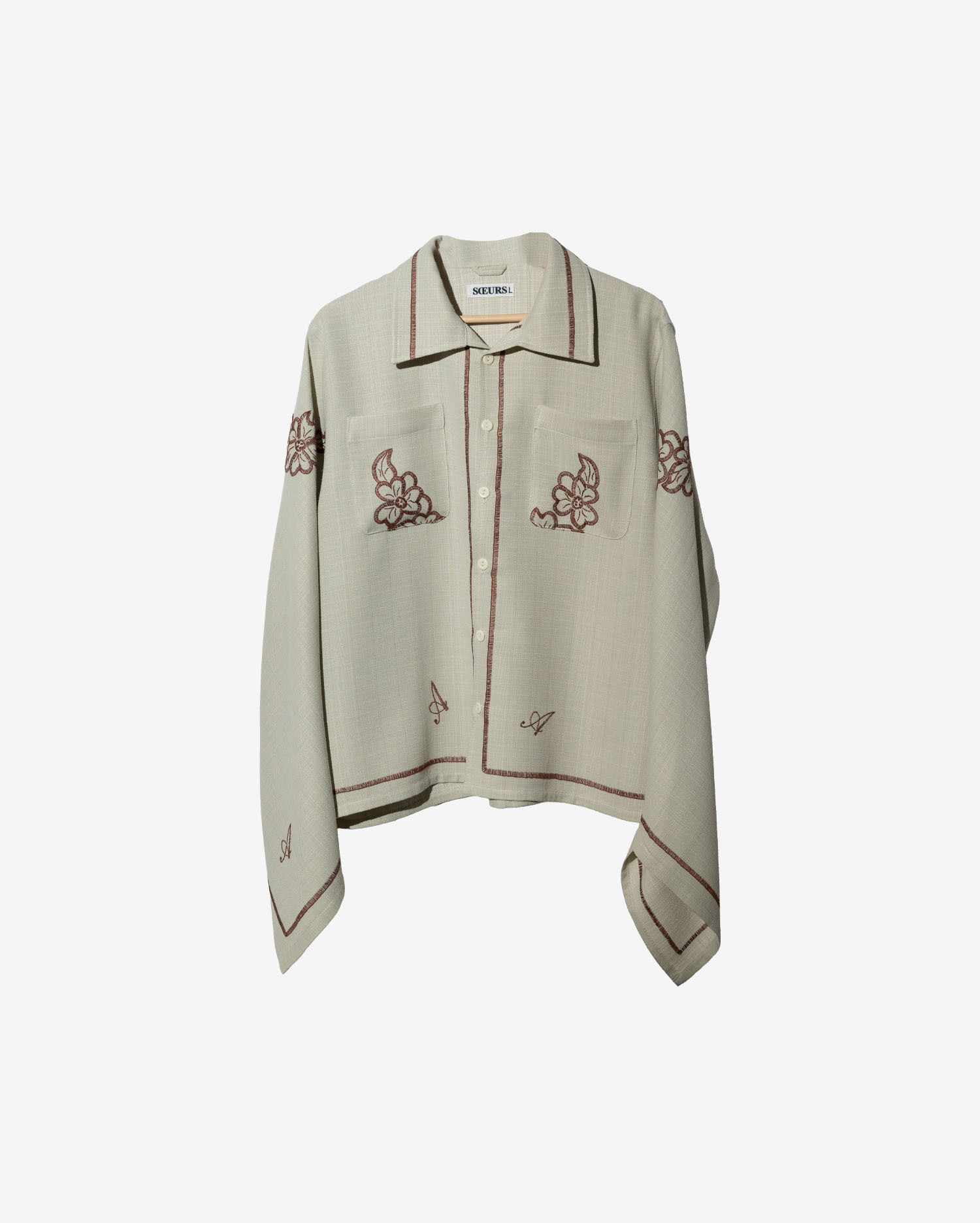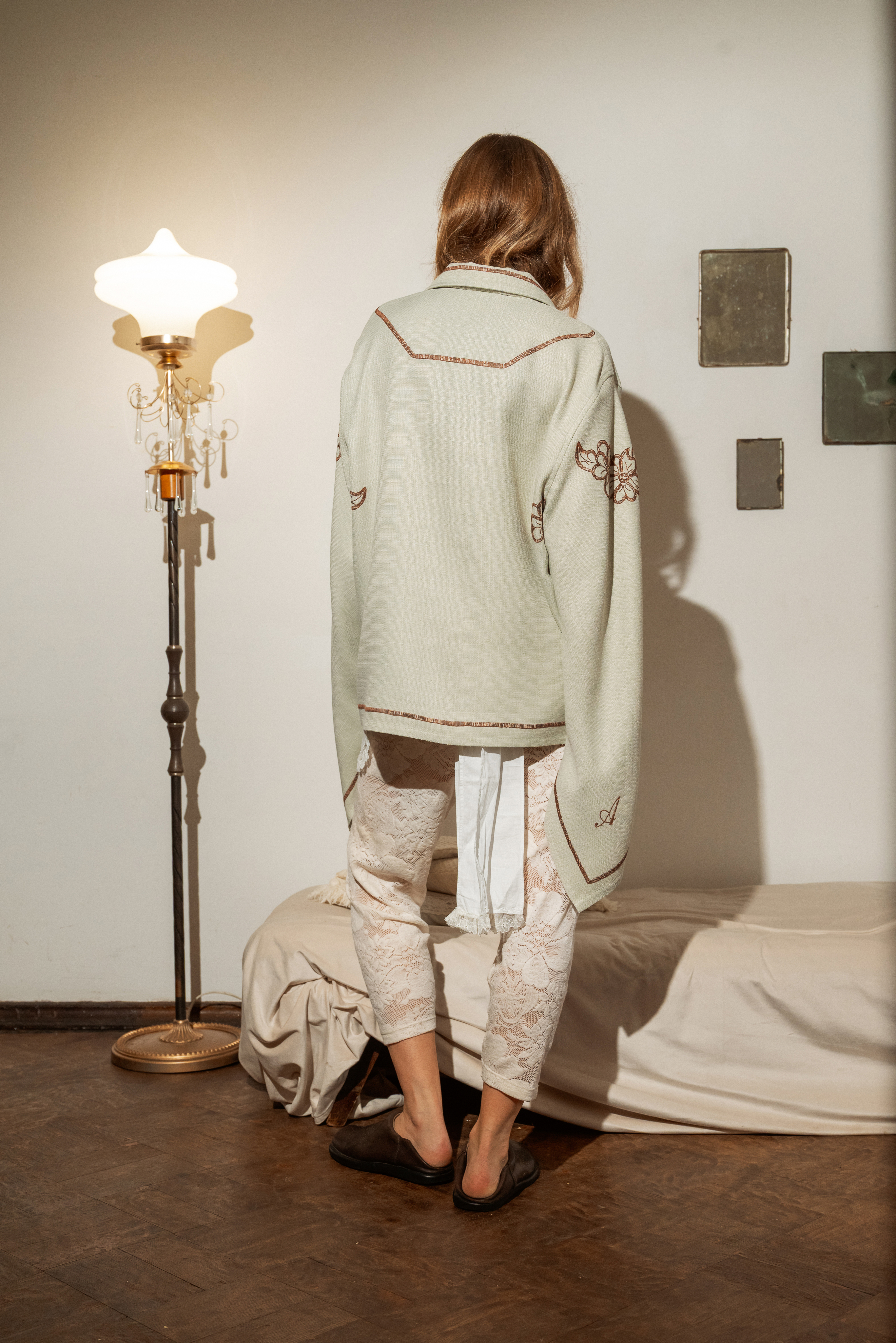 Рубашка с длинными рукавами сшита в одном экземпляре из антикварной скатерти (полиэстер 50%, хлопок 50%), периода 1960х годов. Скатерть украшена вышивкой.