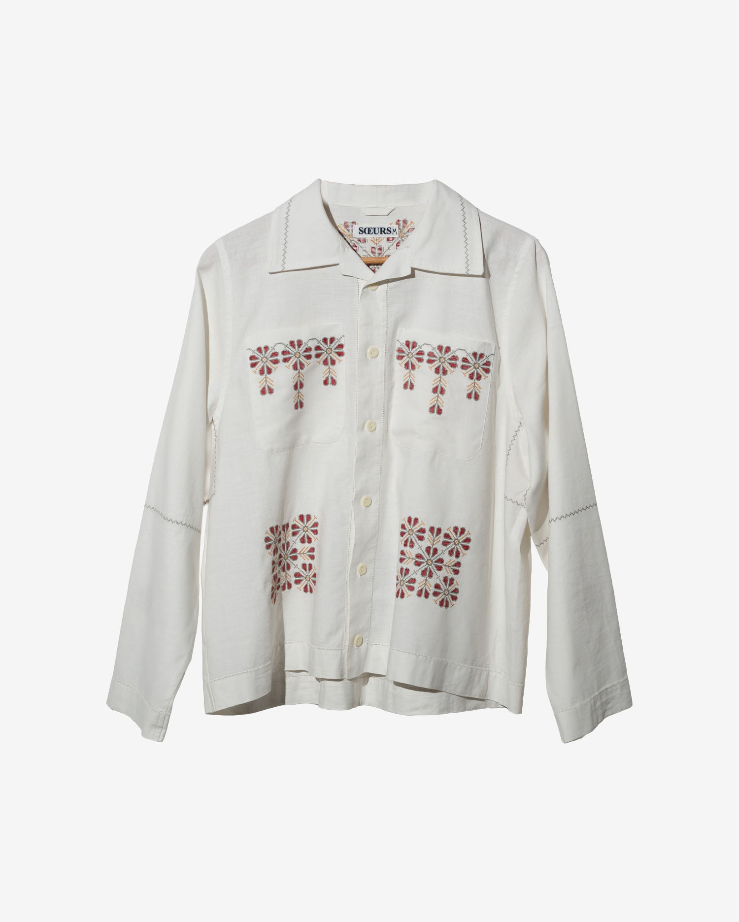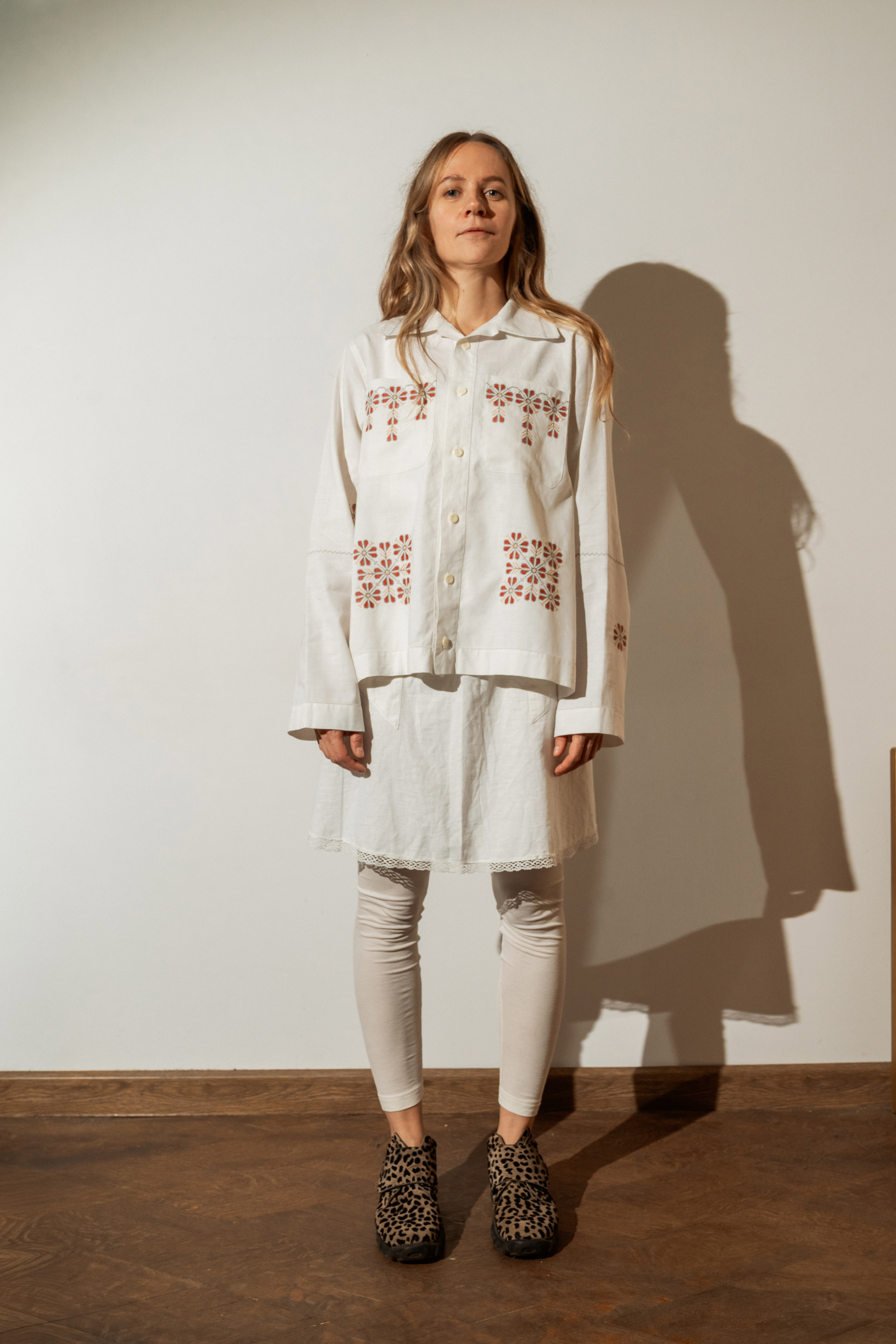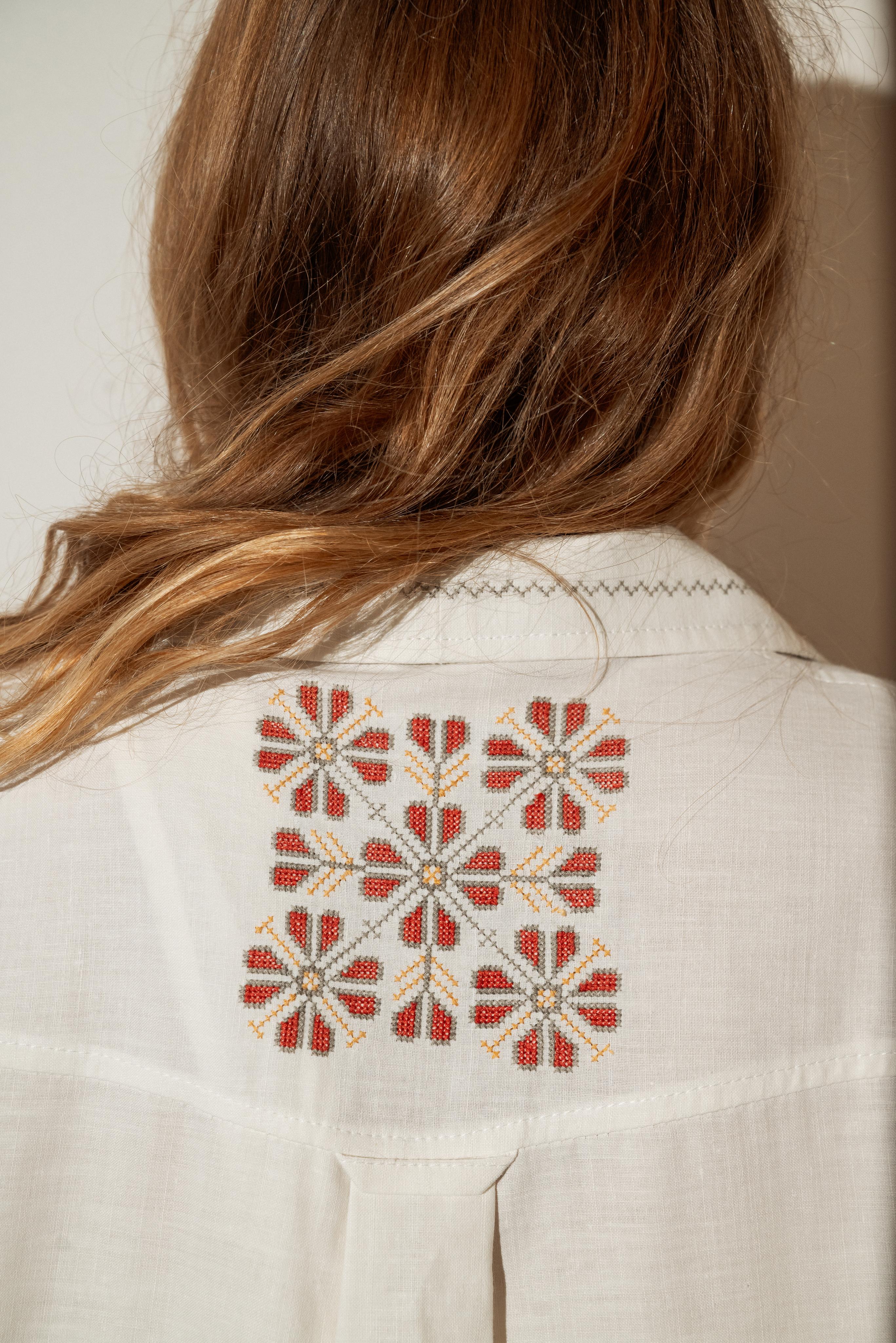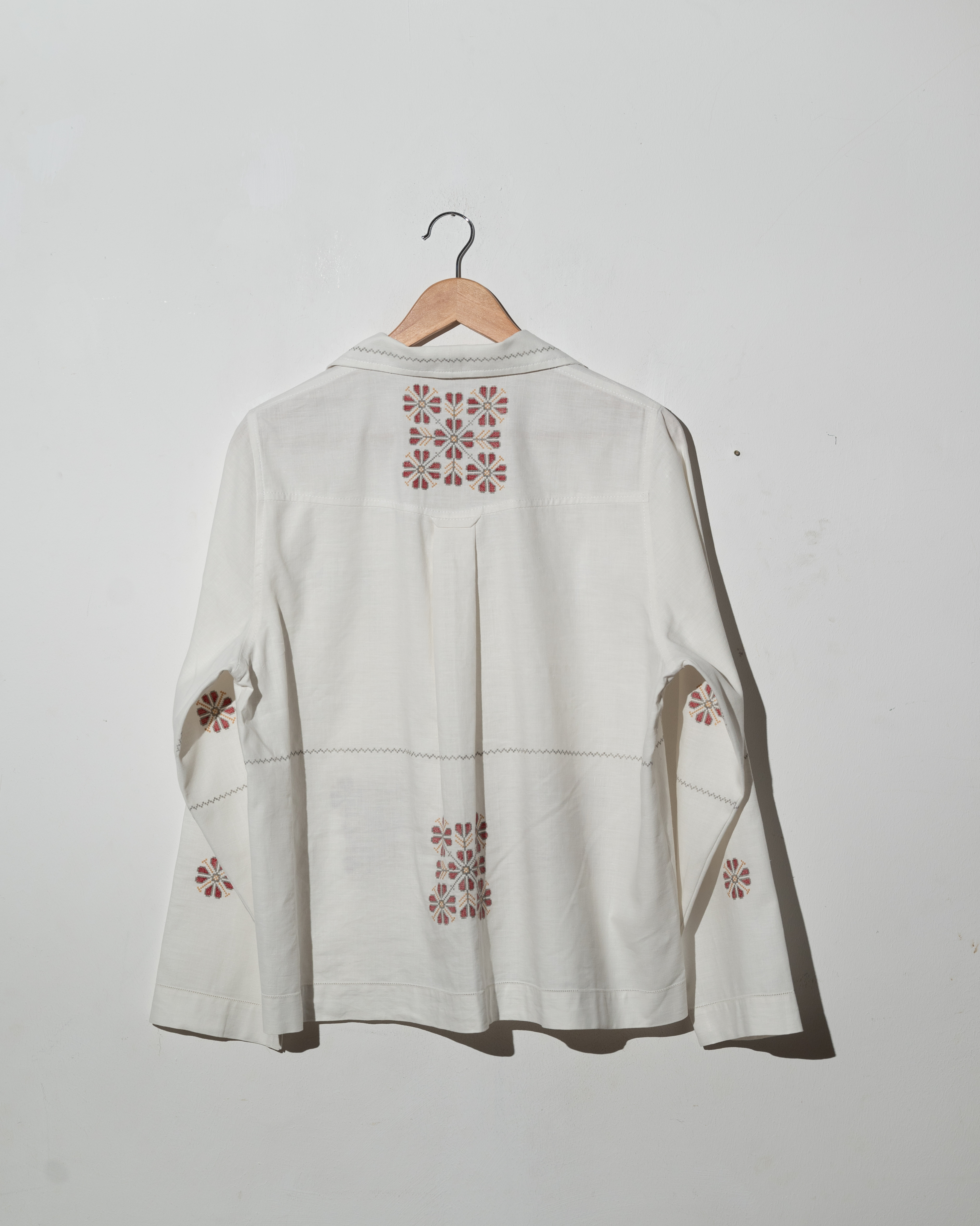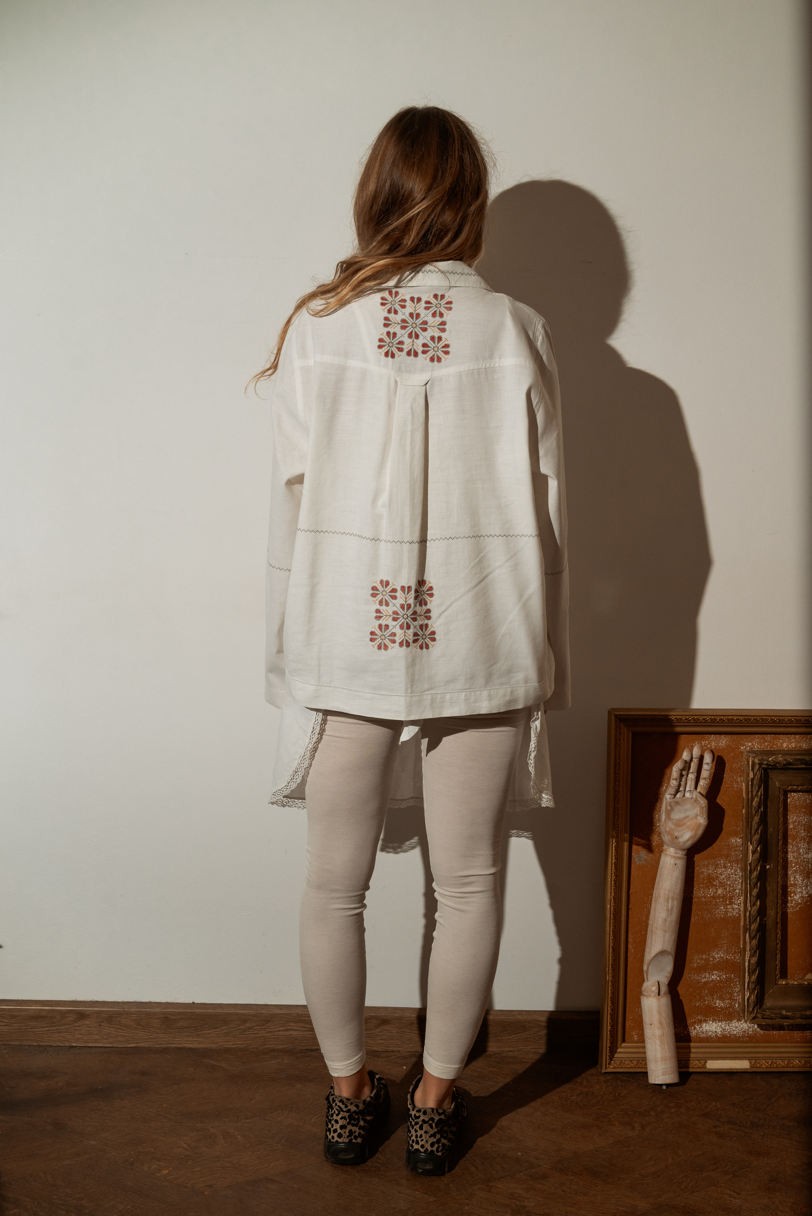 Рубашка с длинными рукавами сшита в одном экземпляре из антикварной хлопковой скатерти (хлопок 100%), периода 1950х годов. Скатерть была украшена повторяющейся геометрической вышивкой.